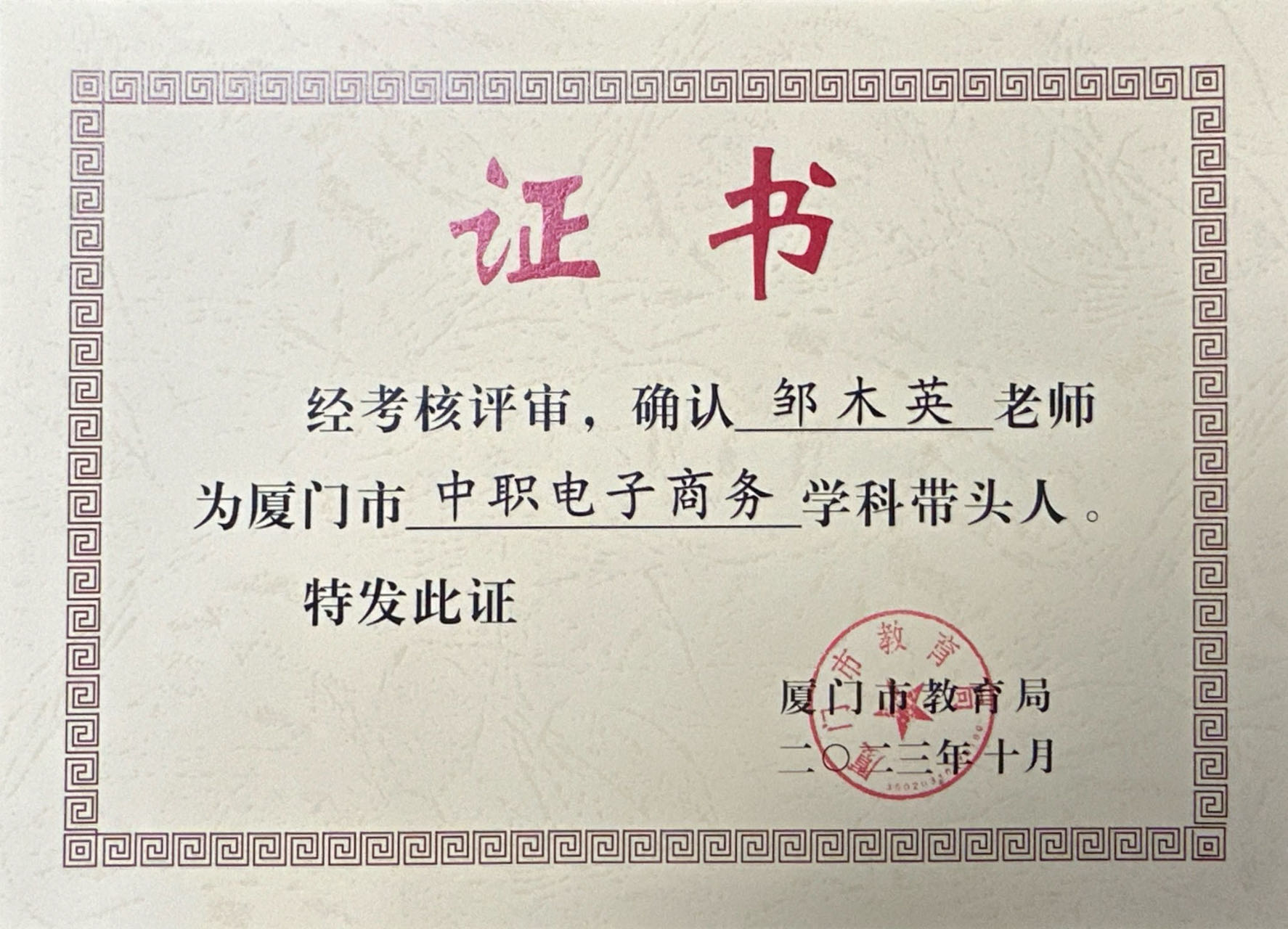 高级讲师,福建省教学创新团队建设负责人,厦门市专家型教师培养对象,厦门市计算机学科带头人,厦门市“双师型”教师,现任厦门信息学校商贸部教学部长。