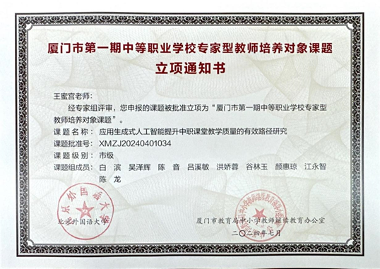 主持市级课题“应用生成式人工智能提升中职课堂教学质量的有效路径研究”,已于2024年开题;