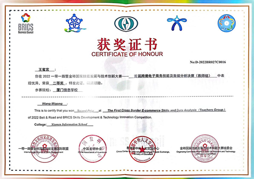 2022年在一带一路暨金砖国家技能发展与技术创新大赛---首届跨境电子商务技能及数据分析(教师组)决赛中获得二等奖;