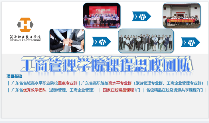 本团队以习近平新时代中国特色社会主义思想为指导,以工商管理学院为依托,以旅游管理、工商企业管理2个广东省优秀教学团队为核心,涵盖广东省高水平专业群旅游管理、工商企业管理2个专业群及相关专业的课程思政示范课负责人、思政课教师、学生管理人员、兼职教师等23人共同组成(其中教授2人、副教授8人、高级会计师1人)。团队人员职称结构合理、教学经验丰富、各类成果丰硕。团队主持1门国家在线精品课程、4门省级精品在线开放课程、3门省级精品资源共享课程,入选省级课堂革命典型案例、广东省优秀教学团队,获得国家旅游局“万名旅游英才”项目14项;团队成员近年来,打造了一批省大学生实践基地及省旅游行业技能培训基地;已经立项21门校级课程思政示范课,3项校级课程思政典型案例。