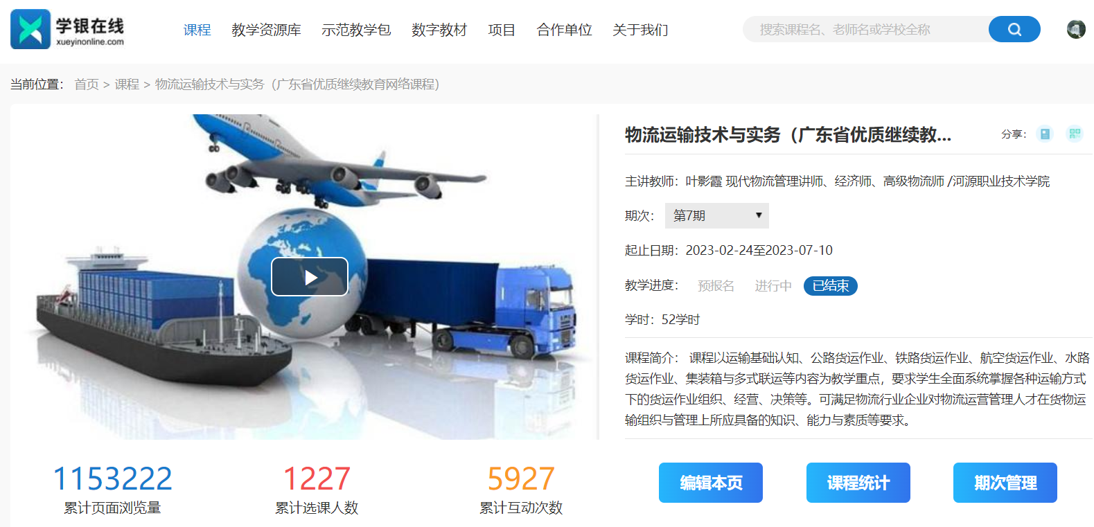 《物流运输技术与实务》是广东省高水平专业群——工商企业管理专业群现代物流管理专业核心课程,是“广东省优质继续教育网络课程”“校级金课”“校级精品课”“校级混改课”“校级课程思政示范课”。课程主要面向高职院校现代物流管理专业二年级学生及企业运输岗位从业者。课程于2022年9月被超星学银在线平台正式收录为“示范教学包”,公开面向全国全网高校物流专业学生、社会自由学习者开放。