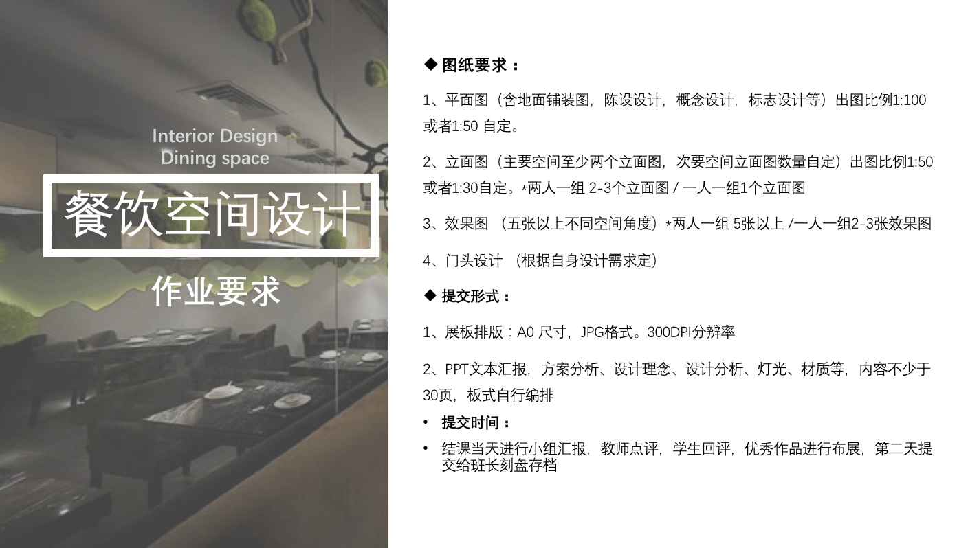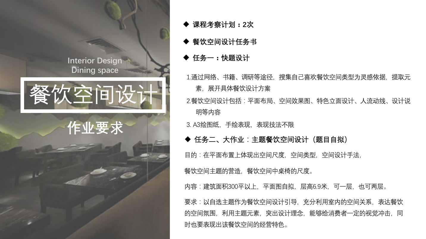 《餐饮空间设计》课程是环境设计专业的必修课程,本课程主要讲述餐饮空间设计的基本概念、发展脉络、设计原理和设计方法;通过餐饮空间设计的形式、功能、色彩、材料、灯光的合理组织,表达出餐饮空间设计的主题,达到塑造适宜空间氛围的目的。借助市场考察调研、方案设计的方式,使学生的设计意识和设计应用能力得到有效的培养和锻炼,全面提高学生的设计实践能力。启发学生对环境设计的学习兴趣,增强学习的主动性。培养学生的艺术造型能力和设计能力。建立和巩固专业思想,为培养学生今后从事艺术设计、教学研究和创作的技能型、适用型人才打下坚实的基础。 教学目标:通过本课程的教学,掌握餐饮空间设计的基本概念,基本原理、设计程序和空间的表现方法,具体学习餐饮空间的序列安排、空间组织、照明运用、色彩表达、材料运用等设计方法与步骤。使学生了解餐饮空间设计的发展历史以及未来趋势,掌握餐饮空间形式变化的实质,学会餐饮空间中的功能布置和细节设计,熟悉空间各部分的处理要点和空间尺度,同时了解餐饮空间中空间风格的创造方法。认识、理解室内空间与建筑、环境之间的关系。 实践目标: 课程设计理论和实践结合,突出以学生为中心的教学策略与方法设计。要求态度严肃认真,制图必须有一定准确性。阶段性组织观摩总结环节,通过讲评作业让学生知道设计中的不足及解决方法。学生交流与分享、反思、鼓励的过程可以很好的提高创新思维。设计灵活多样的教学方法,提供多种学习体验,有效调动学生的学习积极性。 能力培养的要求:通过线上与线下的互动形式激发学生学习热情,线上提供更多的提问、讨论分析、投票等环节,使学生获得更多的思考方法与途径。同时增加每次课堂作业的汇报,学生不仅获得知识,同时有助于提高语言表达能力、讨论技能,从而提升学生的综合实践能力。