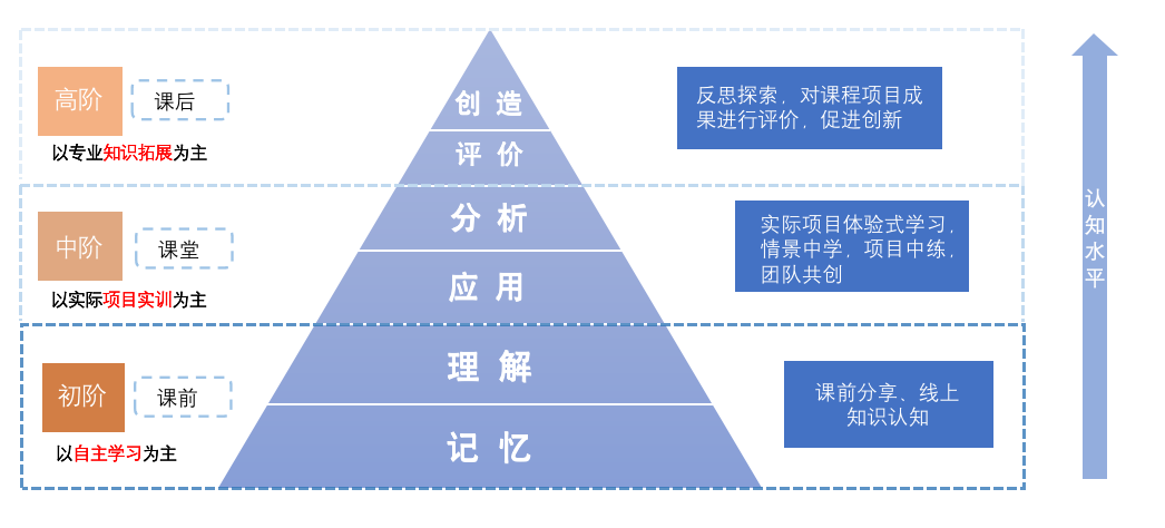 高阶:课后反思探索,以专业知识拓展为主,对课程项目成果进行评价,促进创新。