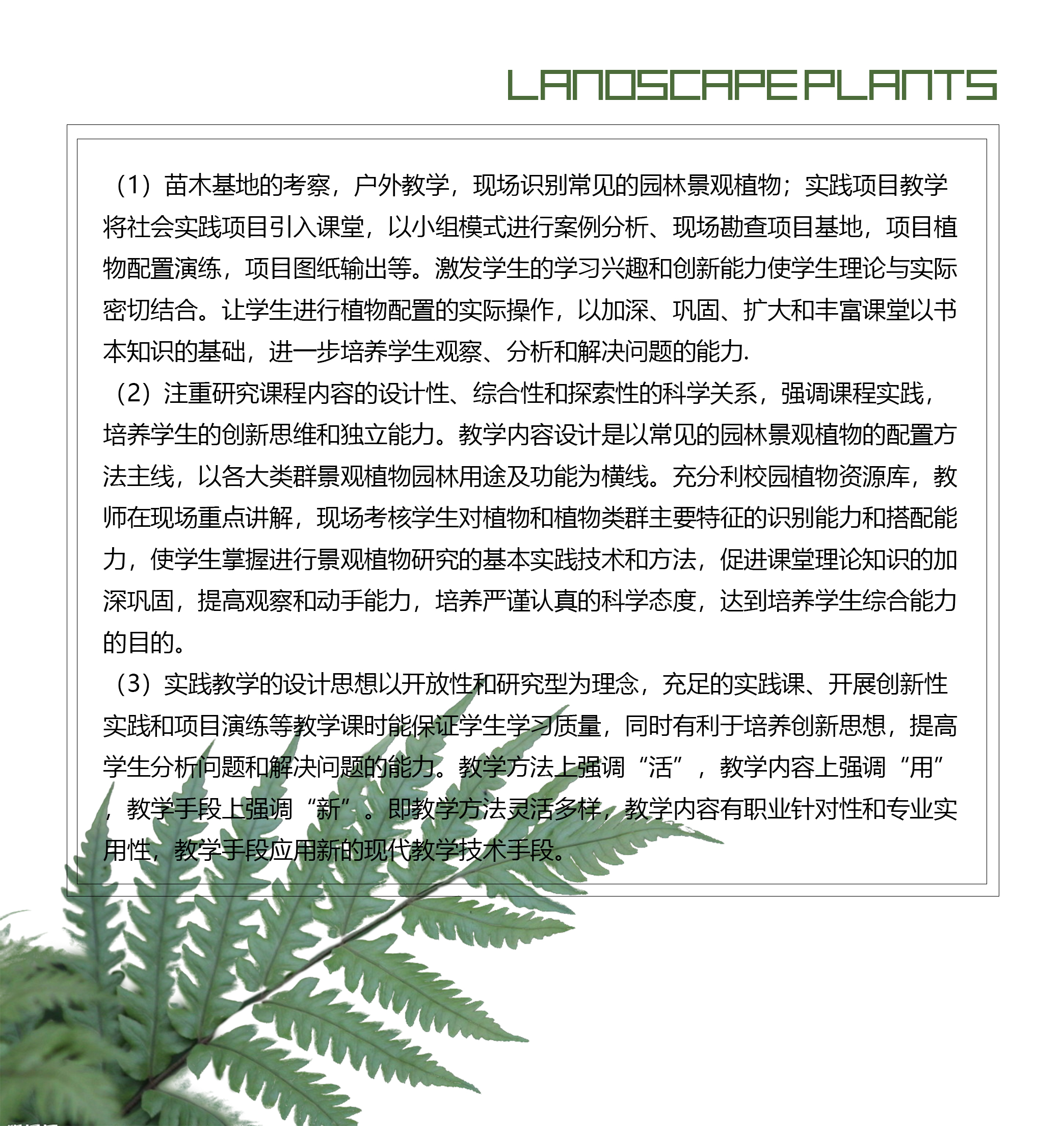 本课程通过绿水青山、郁郁葱葱、千姿百态、生机勃勃、作用斐然、川流不息、庭院深深、水趣盎然、乡村振兴九大模块,融入乡村振兴战略背景下的绿水青山就是金山银山及美丽乡村建设思政教育,培养学生建设祖国大好山河,坚持人类与自然和谐共生的社会责任感。同时课程内容丰富,结合以赛促学的课程实施方式,充分激发学生的学习兴趣和创新能力,提高学生自主学习和解决问题的能力。在课程拓展阅读部分以中国传统文化及美丽乡村建设内容为主,潜移默化的增强学生民族文化自信。并通过校企合作、校村合作的项目导向任务驱动教学方式将理论、实训、实习相融合的教学方式,边讲边学、边学边做、做中学、学中做,把学生培养成为具有良好职业道德的、具有设计能力与创新设计知识的、具有可持续发展能力的高素质高技能型人才,以适应市场对园林景观设计人才的需求。