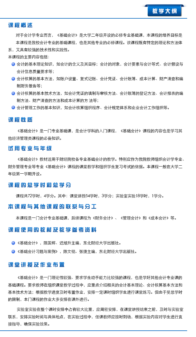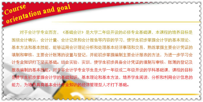 课程介绍: 基础会计课程是我校会计专业的基础课程,也是财务管理等其他专业的必修课程。该课程既有特定的理论和方法体系,又具有较强的技术性和实践性。 本课程的教学目的是使初学者掌握会计的基本理论、基本方法和基本操作技术,为会计专业的学生学习财务会计、管理会计和成本会计等后续专业课程的学习奠定扎实的基础,各章节的内容基本按照会计专业、财务管理专业学生的培养目标的需要予以安排,在内容阐释的深浅程度上,尽量考虑不同层次、不同专业的需要。 课程的主要内容包括:(1)会计的基本理论知识,如会计的含义及其目标;会计的对象,会计要素与会计等式、会计假设与会计信息质量要求等;(2)会计核算的基本方法,如账户设置、复式记账、会计凭证、会计账簿、成本计算、财产清查和编制财务报告等;(3)会计核算的基本技术方法,如会计凭证的填制与审核方法、会计账簿的登记方法、会计报表的编制方法、财产清查的方法和成本计算的方法等;(4)会计管理工作的基本知识,如会计核算组织程序、会计规范体系和企业会计工作组织等。