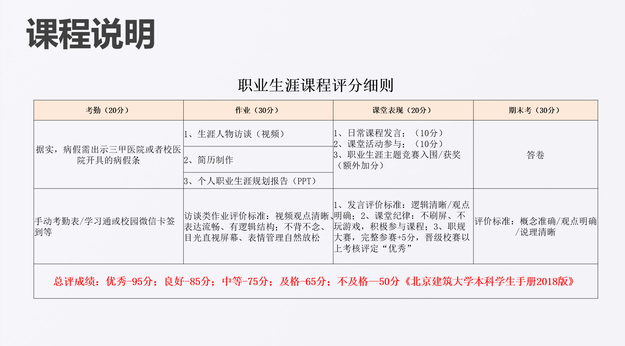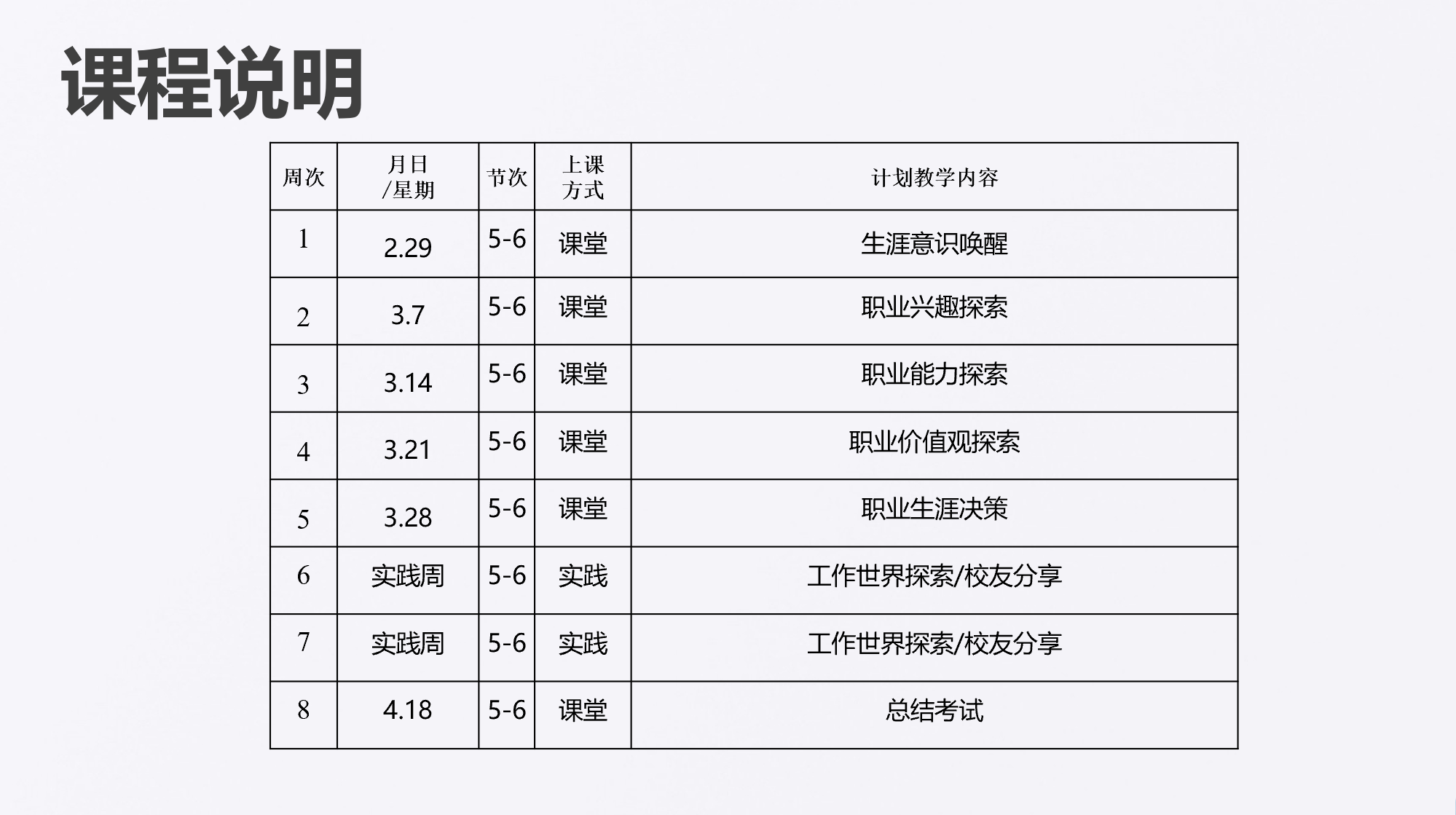 《大学生涯规划与职业发展》是学校面向大一本科生开设的必修课,本课程帮助大学生明确大学阶段的学习生活和未来职业发展的关系,帮助学生更科学地进行自我认知,帮助学生更全面地探索工作世界,让学生掌握科学决策的方法,畅想个人未来的职业生涯。