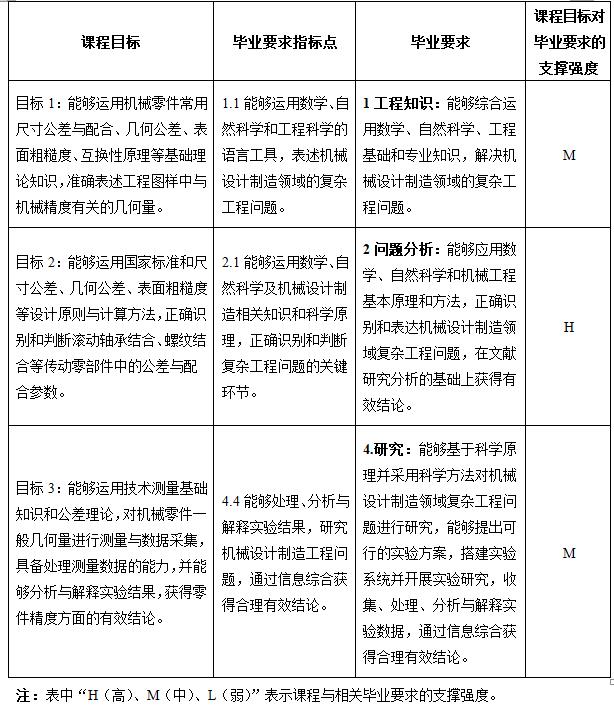 《互换性与测量技术》是机械设计制造及其自动化专业的学科基础课,是必修课。通过课程的学习,主要使学生能够运用机械零件常用尺寸公差与配合、几何公差、表面粗糙度、互换性原理等基础理论知识,准确表述工程图样中与机械精度有关的几何量,正确识别和判断零部件中的公差与配合参数,能够对测量的数据进行处理、分析并获得有效结论,树立理论联系实际的工程观点并解决机械制造工程领域中的相关实际工程问题,为从事机械精度设计方面的工作打下基础。