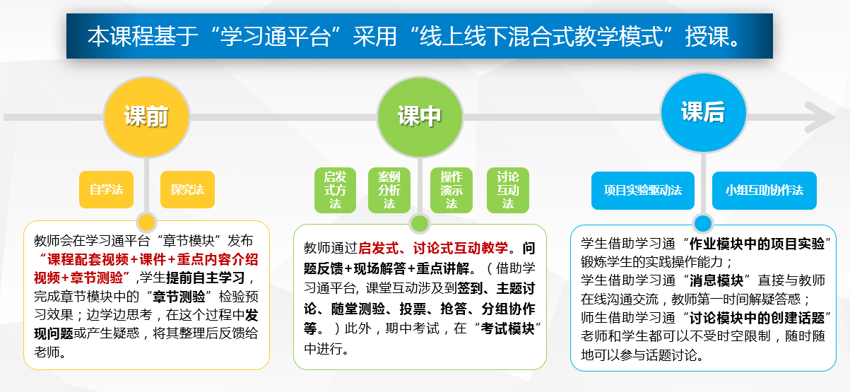 本课程提出并遵循“混合式教学、以学为主、过程育人”的教育教学理念,教学过程中设计并使用了PALSIER和BOPPPS混合式两个教学模型。本课程基于“超星学习通平台”,采用“线上线下混合式教学模式”授课,融合“多种教法、多样任务、多元评价”,融合课程思政、创新创业教育,使“课前”、“课中”、“课后”衔接自然,形成闭环的教学过程。将线上课程的学习数据和线下课堂的互动数据打通,形成线上线下混合式教学的统一教学数据,保证学生学习有痕迹,促使学生主动学,让学生积极参与到课堂教学活动全过程,提升学生的自主探究式学习能力和学习兴趣,实现“以学生发展为中心”的目的。