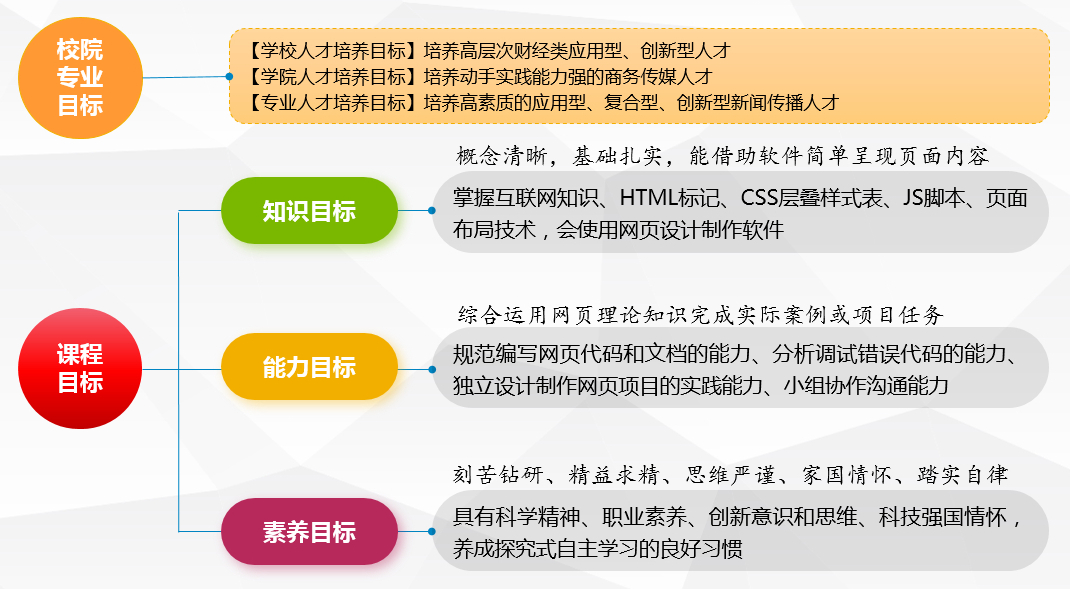 本课程是以培养学生从事网络新闻编辑工作的基本网页设计与制作理论、基本技能和基本素质为主要内容。通过本门课程的学习,要使学生具备在网络时代网络媒体工作者所必须掌握的网页设计和网页制作的主流理论知识、网页设计与制作的实际技术,培养学生最终能熟练进行各类特别是从事各类网络新闻实际工作的素质与能力。
