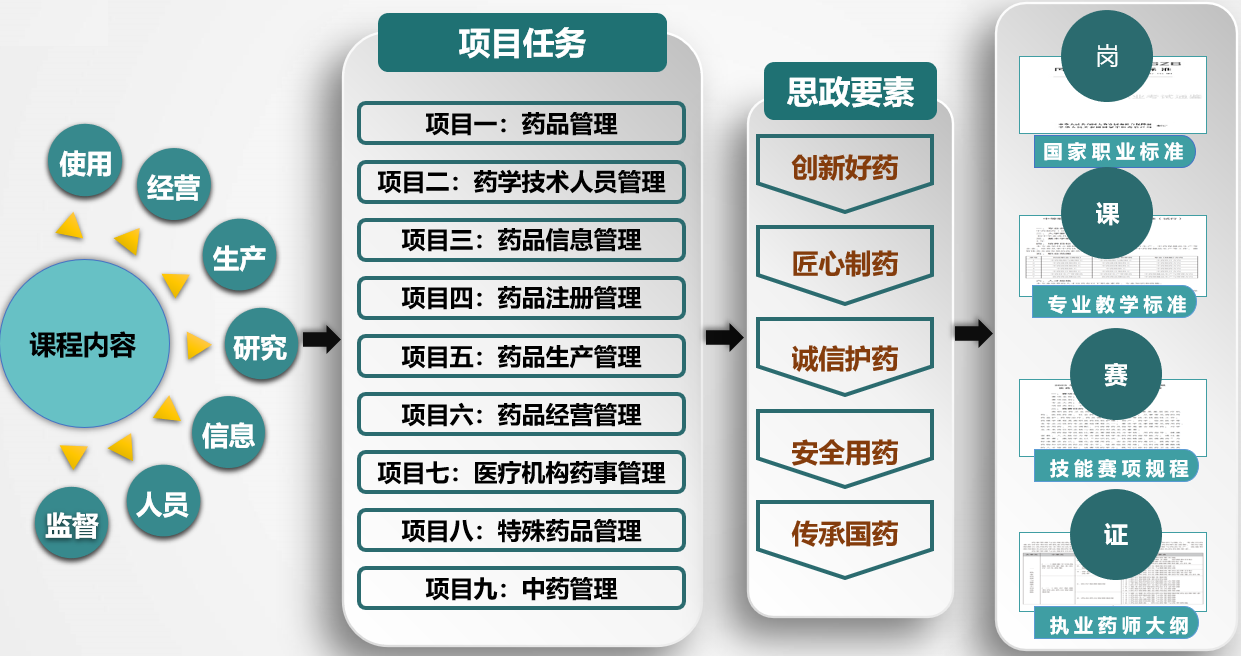 本课程以关键岗位需求为核心驱动,引入药品企业真实项目,设计典型工作任务,将专业教学标准、职业技能等级标准、1+X证书标准、技能竞赛标准进行全面融通,重构课程架构和课程内容,形成“药德引领,知识技能并举”的三维教学目标。