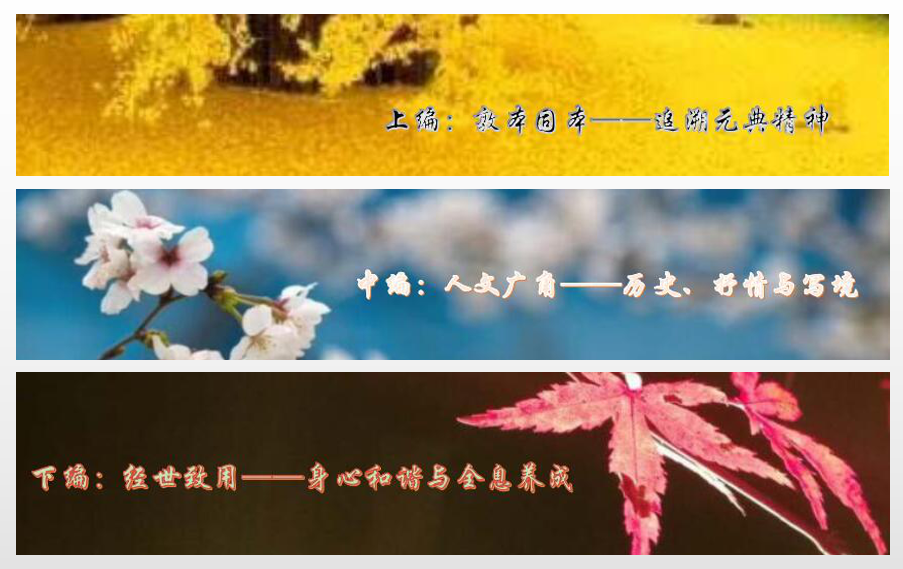 课程总三编十三章50节:上编《敦本固本——追溯元典精神》(1-7章),中编《人文广角——历史、抒情与写境》(8-10章)、下编《经世致用——身心和谐与全息养成》(11-13章),从元典导读出发,继之以人文大观,落脚于经世致用。