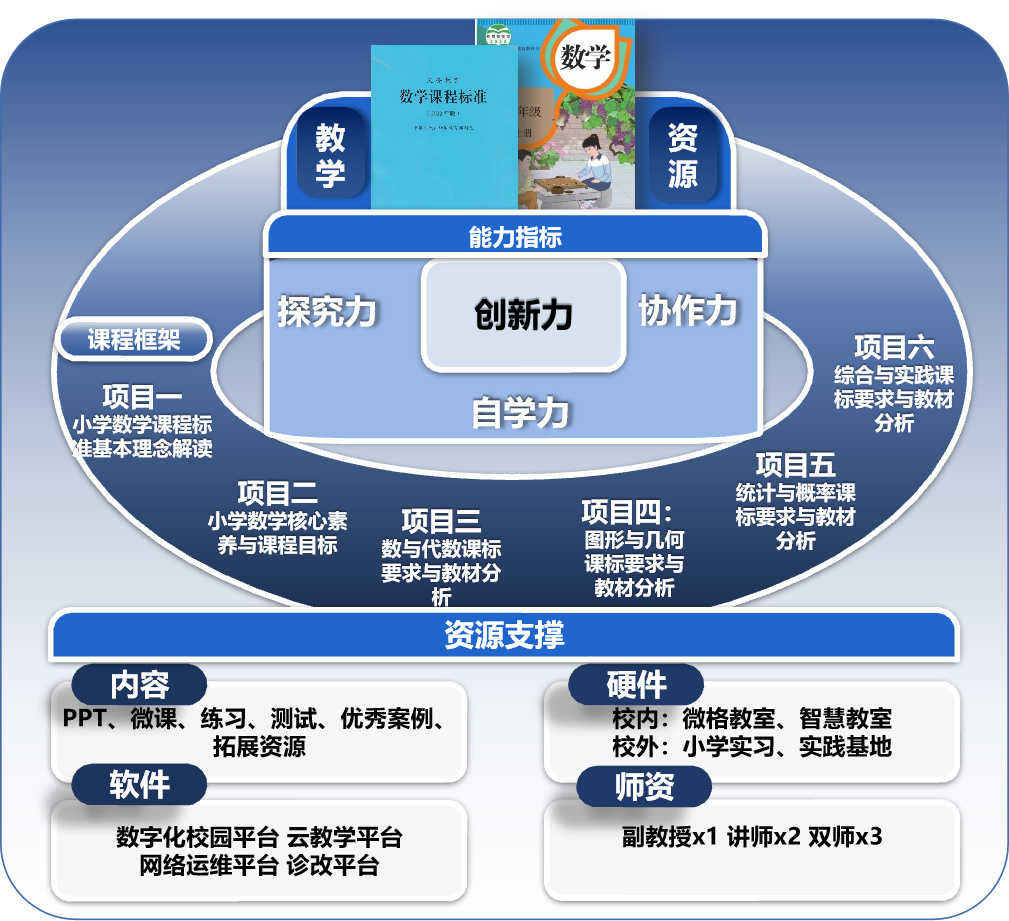本课程立足2022版义务教育课程标准,从培养具有探究力、自学力、协作力、创新力的高素质、复合型未来小学教师角度出发,深入浅出地解读新课程标准,探寻、了解小学数学教材。课程以项目为依托,以团队为形式,经历制定方案、自学材料、深层探究、成果展示、拓展反思等学习环节,在做中学,学中做,从实践层面促进学习者更准确地理解新课程标准的要求,体会其价值。除常规的PPT、录课、测试、练习等学习资源外,另增加优秀项目案例、教研杂谈等多种形式的学习资源帮助学习者更灵活地理解知识,应用知识,不仅为在校生后续课程的学习奠定基础,也为一线小学数学教师提供教研的交流平台。