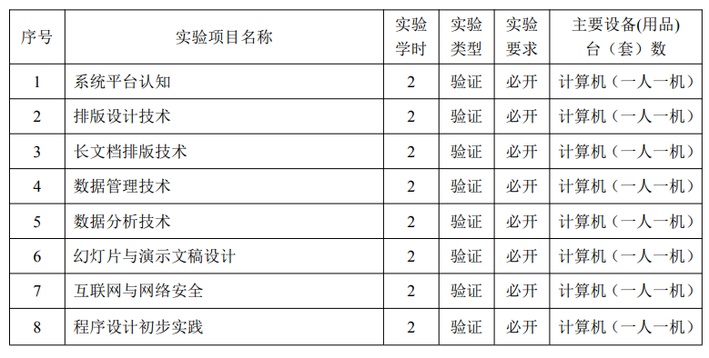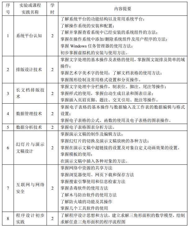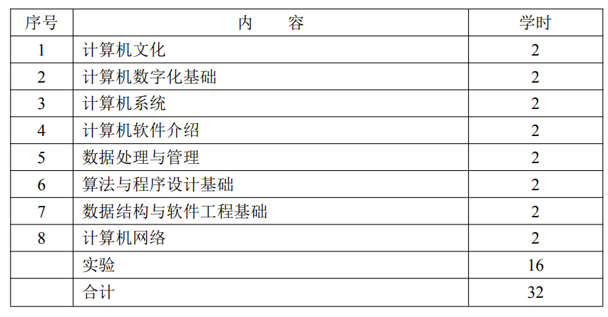 课程作用与目的 《大学计算机基础》是一门计算机的通识核心课程,面向高等院校非计算机专业学生开设,是许多后续专业课程的基础课,也是大学生计算机教育中的必修课程,在课程体系中占据重要基础地位。该课程主要培养学生操作和使用计算机的基本技能,同时具有使用计算机获取信息与解决问题的能力,以满足和适应信息化社会对大学生基本素质的要求。 本课程具有注重基本理论和基础知识、注重基本操作技能和实用能力等特点,可以培养学生的重视基本知识和重视计算机实际操作技能的基本素质,使学生树立理论联系实际的科学观点。考虑到农业、生物、理工类专业特点和后续课程学习的需要,有针对性的拓宽知识要求,另外加强程序设计知识方面的要求。 课程目标 1. 对计算机的基础知识,计算机系统、网络基础知识、信息安全等基本知识有一个全面、清楚的理解和认识; 2. 提高利用计算机进行各领域数据的编辑、处理等应用技能; 3. 培养学生的计算思维和信息素养,为以后的专业学习打下坚实的基础; 课程设计原则 1. 理论和操作相结合,围绕计算机理论知识,注重操作能力的培养; 2. 实例驱动教学,实验课通过实例设计驱动学生对操作的兴趣与理论的理解; 3. 注重自主学习能力的培养,理论课通过“翻转式课堂”引导学生自觉应用计算思维来解决专业和实际应用问题。