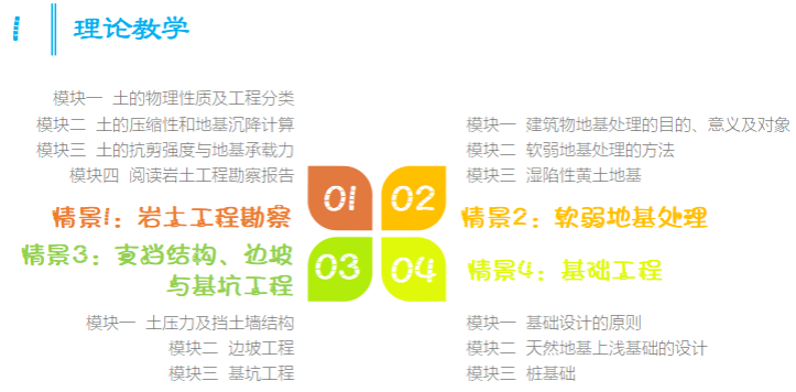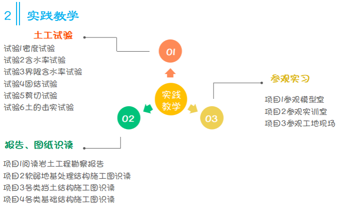 “一图”即:一套案例引领施工图---《建筑工程技术专业核心课实训导图》“两册”即:《地基与基础工程学生学习手册》和《地基与基础工程教师教学手册》;“一库”即:教学资源库,以及教法情景专用教室。
