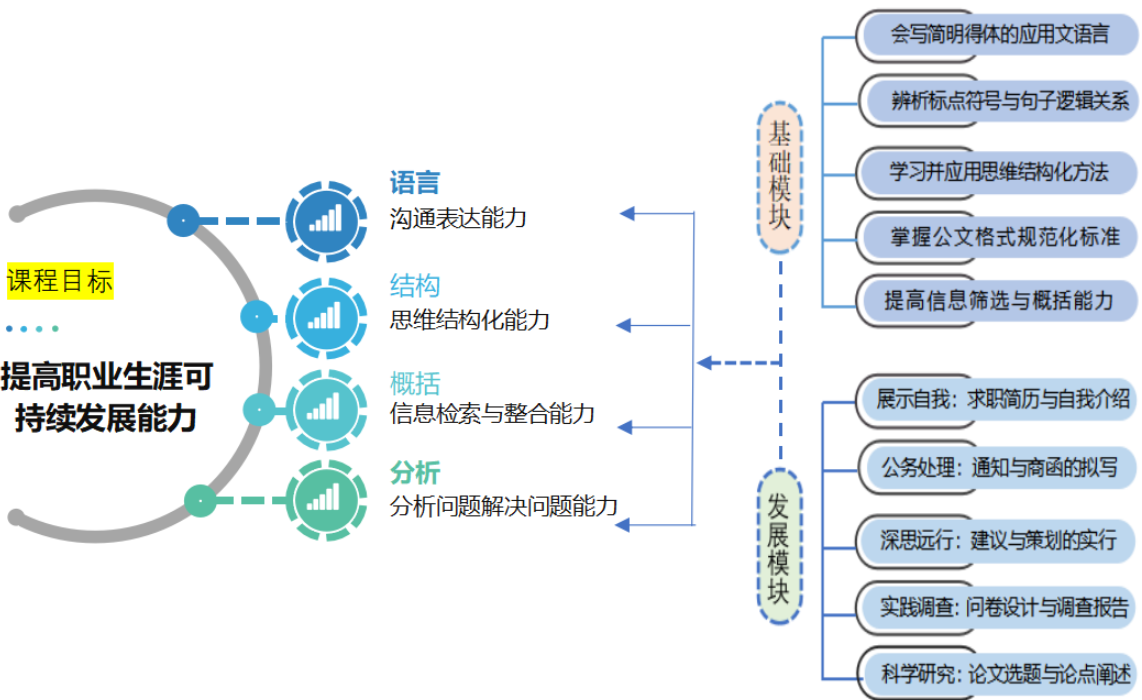在内容的设置上分基础模块与发展模块,基础模块解决写作中存在的最突出的三大“共性问题”——语句不通顺问题、结构紊乱问题、内容空洞问题,培养语句通顺表达能力、思维结构化能力、信息检索与整合能力;“发展模块”则是应用文写作的具体实践,满足学习者的个性需求,选取大学生最急需学习,且在大学的学习工作实践中经常使用的文种进行写作实践,激发写作的内在动机,培养针对具体问题的分析问题、解决问题的能力。