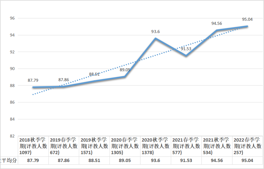 我校应用文写作课程面向全校学生开设,每学年平均选课人数1695人次,专任教师4人,兼职3人,对2018年秋季学期至2022年春季学期应用文写作所有任课教师(含兼职教师)的学评教进行统计,2018年秋季至2022年春季应用文写作学评教平均分呈逐步上升趋势(本次数据采集自温州商学院学术事务部所提供的2018年秋-2022年春学评教成绩)。