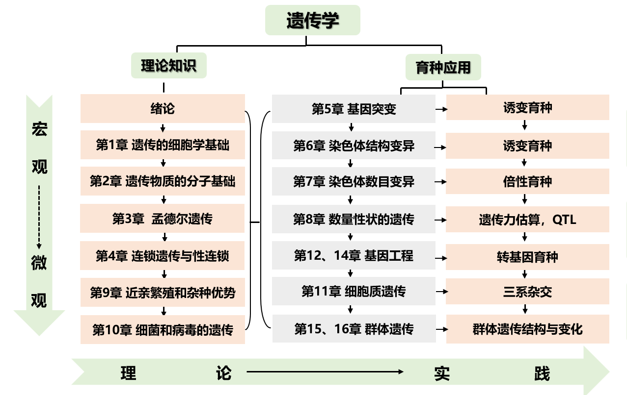 遗传与变异是生命的重要特征,更是生命演化的关键机制。遗传与变异相辅相成,使得生命既能够代代相传,生生不息,又能够推陈出新,层出不穷。遗传学是高等农业院校农学类专业的重要专业基础课程和生物类专业的骨干课程。遗传学也是现代生物学中发展最迅速、与其它自然科学、社会科学以及技术科学交叉最多的学科之一,是新技术革命的动力学科。本门课程主要是运用分析和推论的方法阐述遗传学原理,包括孟德尔遗传分析、连锁遗传分析、病毒和细菌的遗传分析、遗传重组、核外遗传、染色体结构和数目的变异、基因突变、群体遗传与进化、数量遗传学基础等内容。通过本门课程的学习,使学生在有限的时间内,系统地了解普通遗传学的基本知识,掌握基本理论和基本技能,触摸到本学科发展动态的前沿。通过本门课程的学习,使学生了解遗传的研究内容,掌握遗传学的主要研究方法和研究思路,为其他学科的学习打下基础。