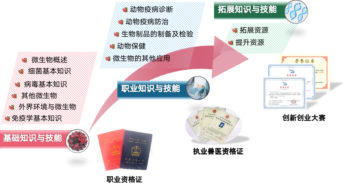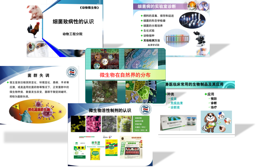 《动物微生物》课程以学习者为中心,针对课程教学目标,重构资源体系,开发了基于五大职业岗位工作过程的课程体系和教学内容,主要内容包括平台知识与技能、职业知识与证书、专业拓展与提升”三级知识体系。本课程为动物疫病检疫检验员、动物疫病防治员、兽用生物制品监理、饲料检验与化验工、食品卫生检验员(微生物方向)等五个职业工种,提供了专业性、标准化的学习资源,通过该资源的学习,采用案例、练习、讨论和提问等教学手段,着重训练同学面向五个职业岗位方向的素养与能力,提升同学们的综合分析能力、综合应用能力,帮助学生成长为行业认可和需要的可持续性发展的(“高、精、尖”)专业技术人才。