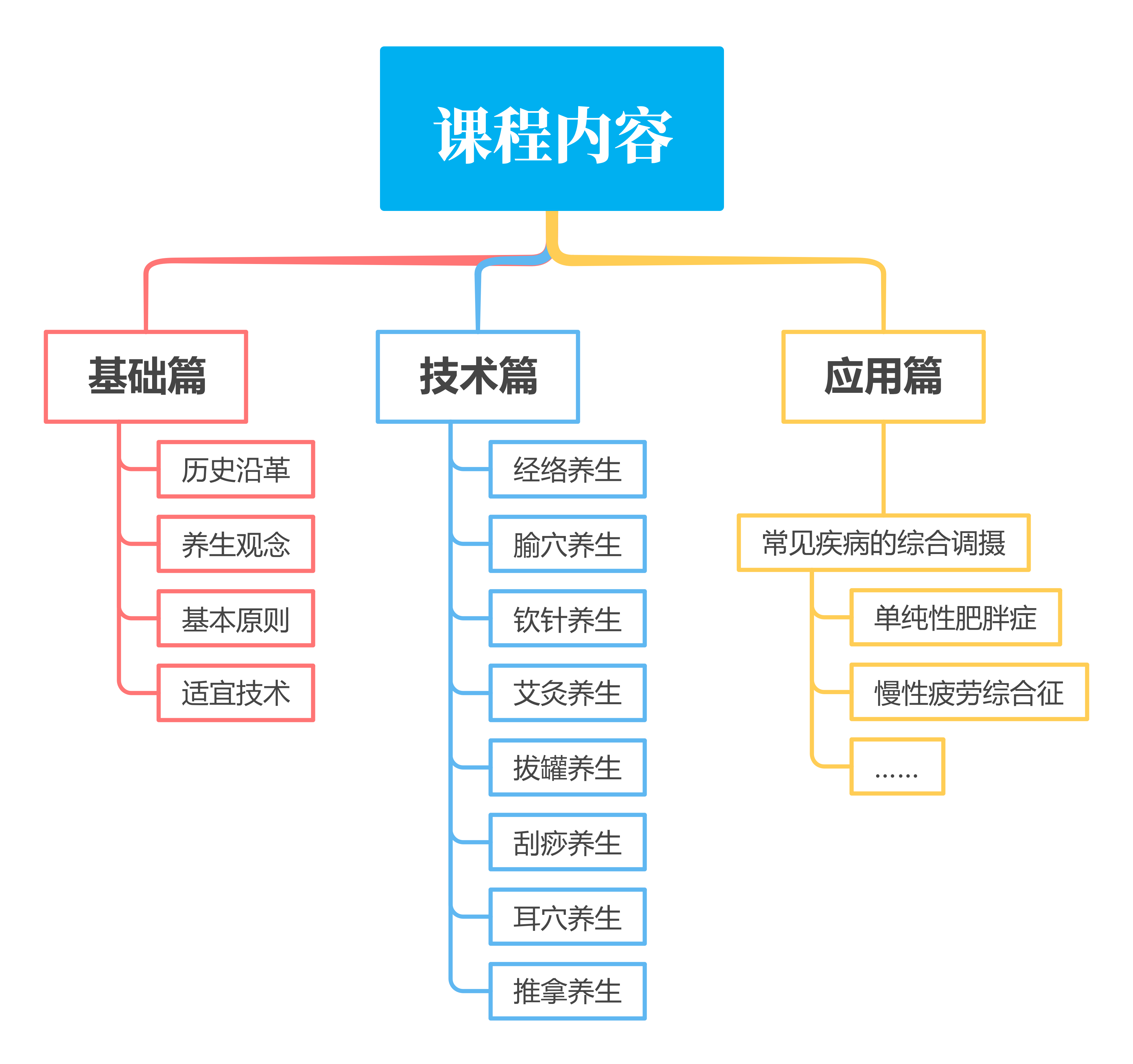 针灸推拿养生学这门课程主要包括三部分内容,第一部分是基础篇,主要讲授针灸推拿养生的历史沿革、养生观念和基本原则及针推适宜技术的概况;第二部分是技术篇,主要讲授经络养生、腧穴养生、揿针养生、艾灸养生、拔罐养生、刮痧养生、耳穴养生、推拿养生;第三部分是应用篇,主要讲授针灸推拿适宜技术在常见病、慢性病中的综合调摄应用,如单纯性肥胖症、慢性疲劳症等疾病。