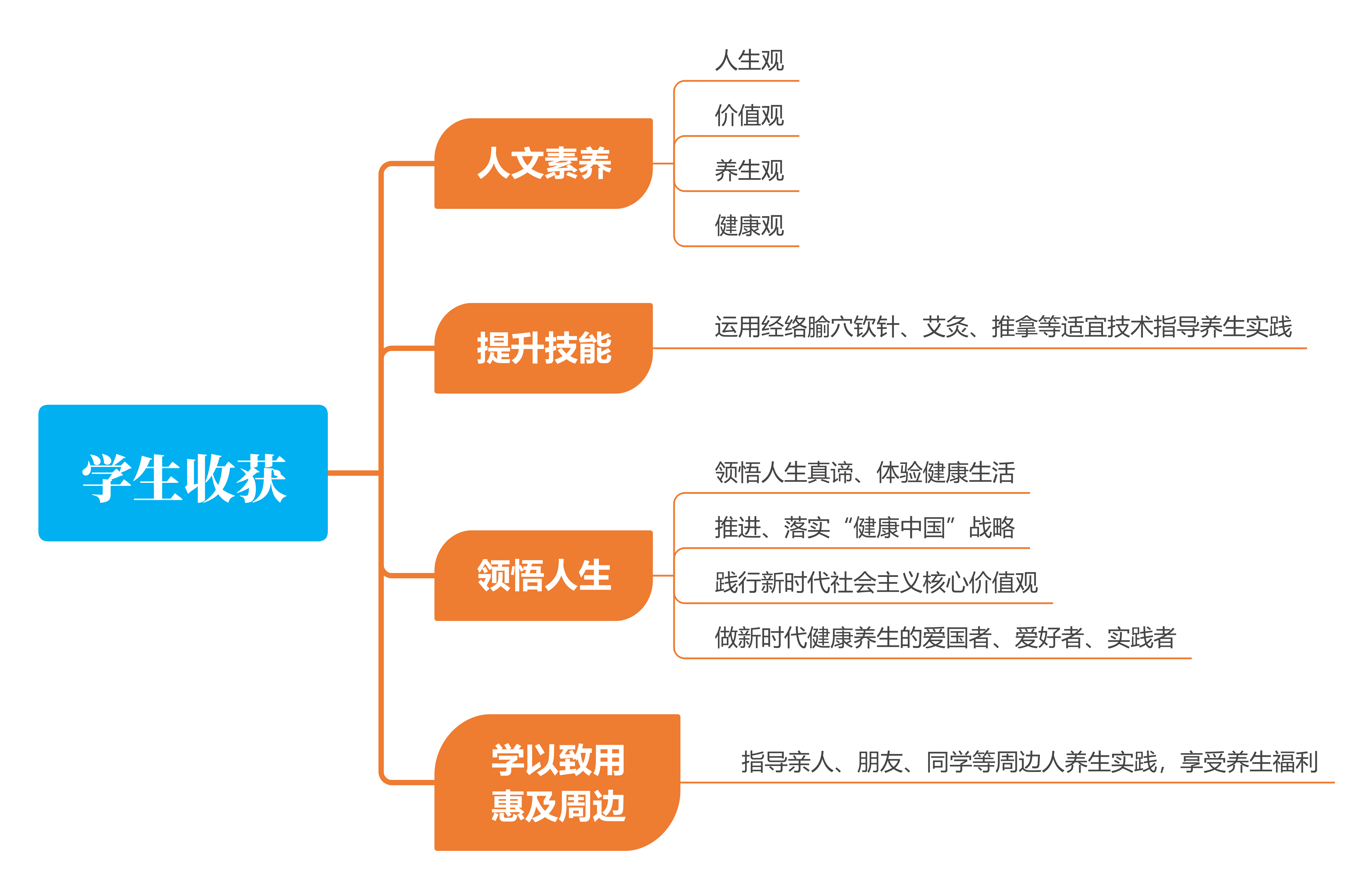 课程教学采用线上+线下混合式学习,引入PBL教学、POB教学、思维导图法教学、场景体验式教学等方法,使学生初步具备养生的基本技术能力,能够独立运用简单适宜技术指导养生实践,全面提高学生的养生综合能力。