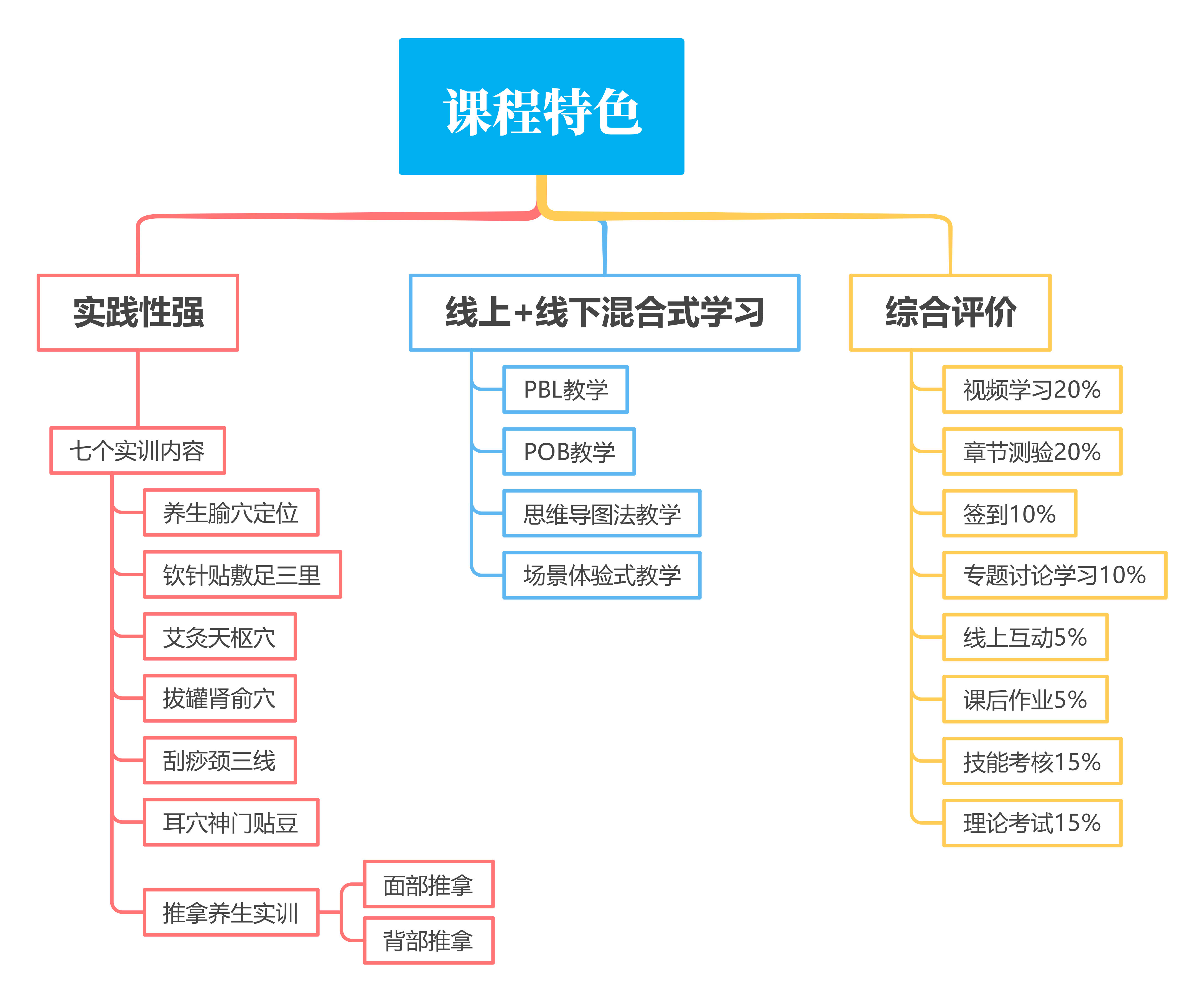 课程采用线上+线下混合式学习,引入PBL教学、POB教学、思维导图法教学、场景体验式教学等方法,全面培养学生的养生综合能力。