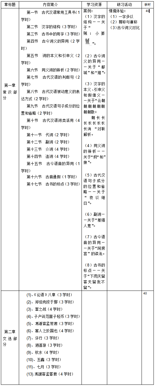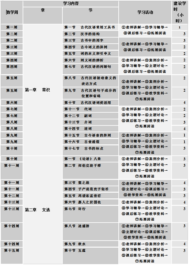 本课程贴近成人教育特点,注重学生提高学历层次和中文素养的目的,以有助他(她)们的工作,因此在课程目标上不片面追求学术性,不在难、偏的内容上下功夫,而是根据学生的实际需要规定教学内容。本课程的教学内容注重古代汉语的知识基础和阅读基础,在提高文言文实际阅读能力这个应用目标上下功夫。所规定作为学习内容的章节知识结构合理,知识点覆盖面达到了课程定位要求;所选文选也是做到精读篇目重点学习,以此带动泛读篇目的浏览。为了开阔学生的眼界,常识每一节后都介绍了与本节内容相关的拓展资料,此外,知识库里既有关于常用词的介绍,还有古代文化常识的介绍,另外还设有内容有所拓展的题典,这些内容,对于有进一步学习要求的学习者都带有很好的导向作用。