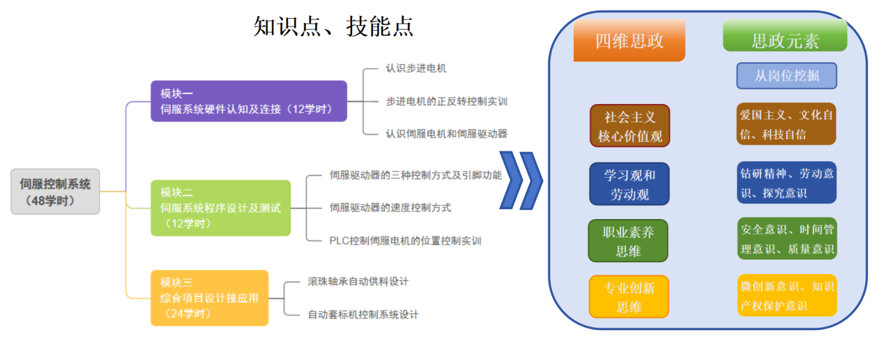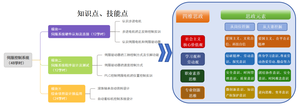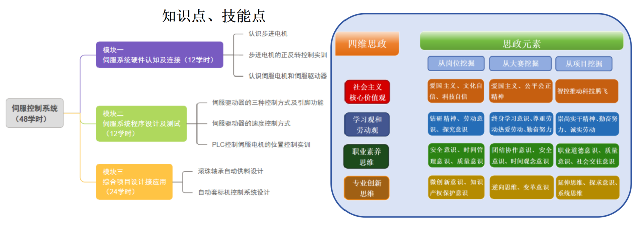 本课程组专业教师,通过企业调研,与企业专家共同分析机电设备维修员、可编程系统设计师等岗位的职责要求,梳理知识点、技能点、专业素养点,并联合学校思政老师,校企双方协同挖掘岗位职责思政元素