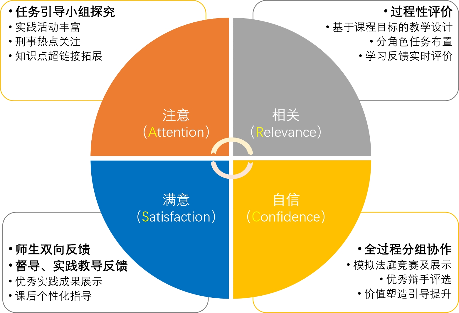 教学活动采用ARCS教学模型设计。设计混合式教学活动调动学生学习动机,小组探究微视频、刑事典型案例等主题任务提升学生关注;过程性评价激励学生主动学习和思辨;分层级任务路径提高课程的高阶性和挑战度;全时间、全空间融入思政元素,增添学生爱国情怀,引导价值塑造和提升自信;全过程小组协作教学有利于形成共同利益观,提高团队合作意识,培养协同精神;师生双向多轮实时反馈教学保证了课程的改进和创新;微课视频推送扫清了部分学生的学习障碍;模拟法庭竞赛及展示、优秀辩手评选等方式激励学生认真求学、严谨做事,追求卓越的科学品质。