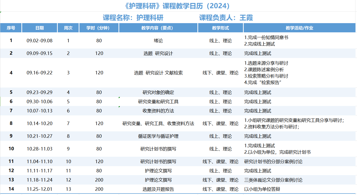 本课程为护理学类专业的核心课程。课程面向新医科建设中对护理学专业人才多元化的要求和学生个性化发展的需求,始终注重立德树人,以学生为中心,有效支撑护理领域应用研究型人才培养目标的达成。构建以需求、问题和创新为导向,注重引导学生分析及解决复杂问题和创新能力培养的课程结构引导学生自主探究。教学内容的重构侧重于“两