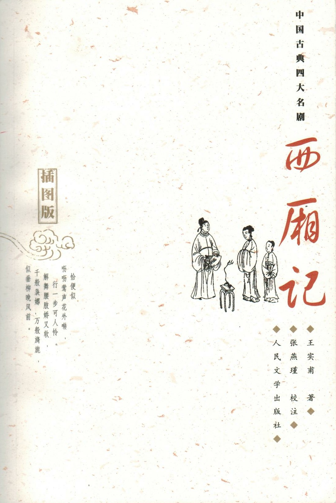 《西厢记》是元代著名剧作家王实甫的代表作,大约写于元贞、大德年间,是一部优美动人的言情传奇小说,深受男女青年的喜爱,被誉为“西厢记天下夺魁”。《西厢记》是中国古典四大名剧之一,主要搬演书生张君瑞与崔相国之女崔莺莺的爱情故事,表现了反对封建礼教和封建婚姻制度的进步思想,而且它在戏剧冲突、结构安排、人物塑造等方面,都取得了很高的艺术成就,成为元杂剧的“压卷”之作。本书有着很高的艺术成就,最为后世所称道者,是其曲词的华美与优雅,被誉为“千古绝技”。