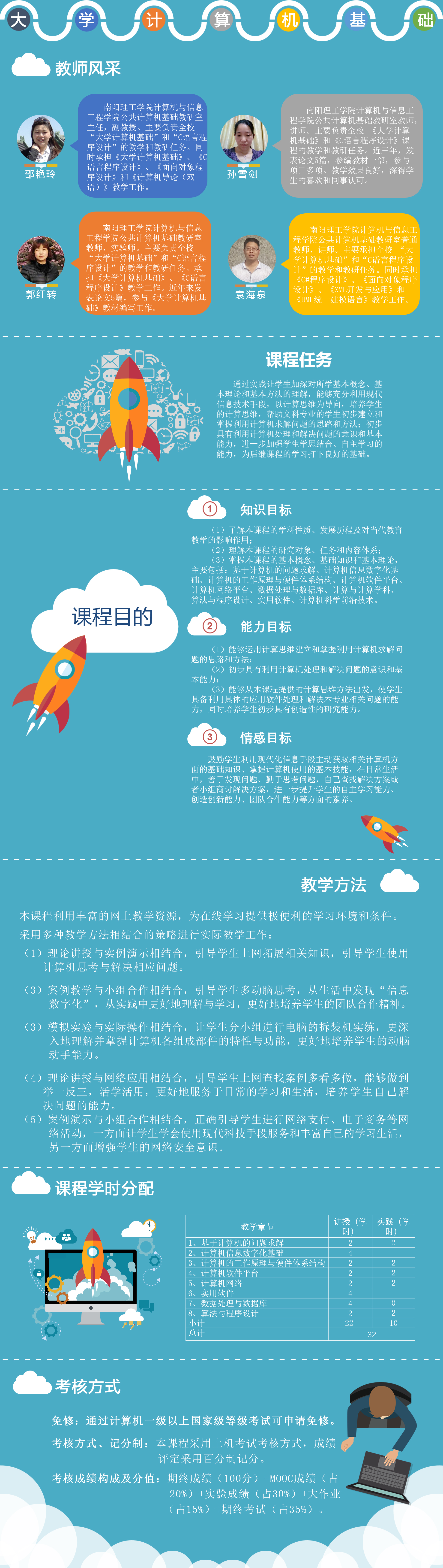 《大学计算机基础》是为非计算机专业学生开设的第一门公共计算机基础必须课程。内容涉及计算机基础理论、系统平台以及计算机在数据处理和程序处理等的初步应用。教学目的是以培养学生计算思维为主线,学生完成该课程学习后,初步建立和掌握利用计算机求解问题的思路和方法;初步具有利用计算机来处理和解决实际问题基本能力,并为后继计算机课程的学习打下良好的基础。