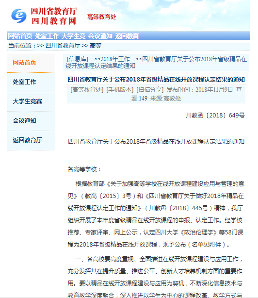 《幼儿活动设计》经四川省教育厅批准确立为2018年省级精品在线开放课程(川教函【2018】649号)