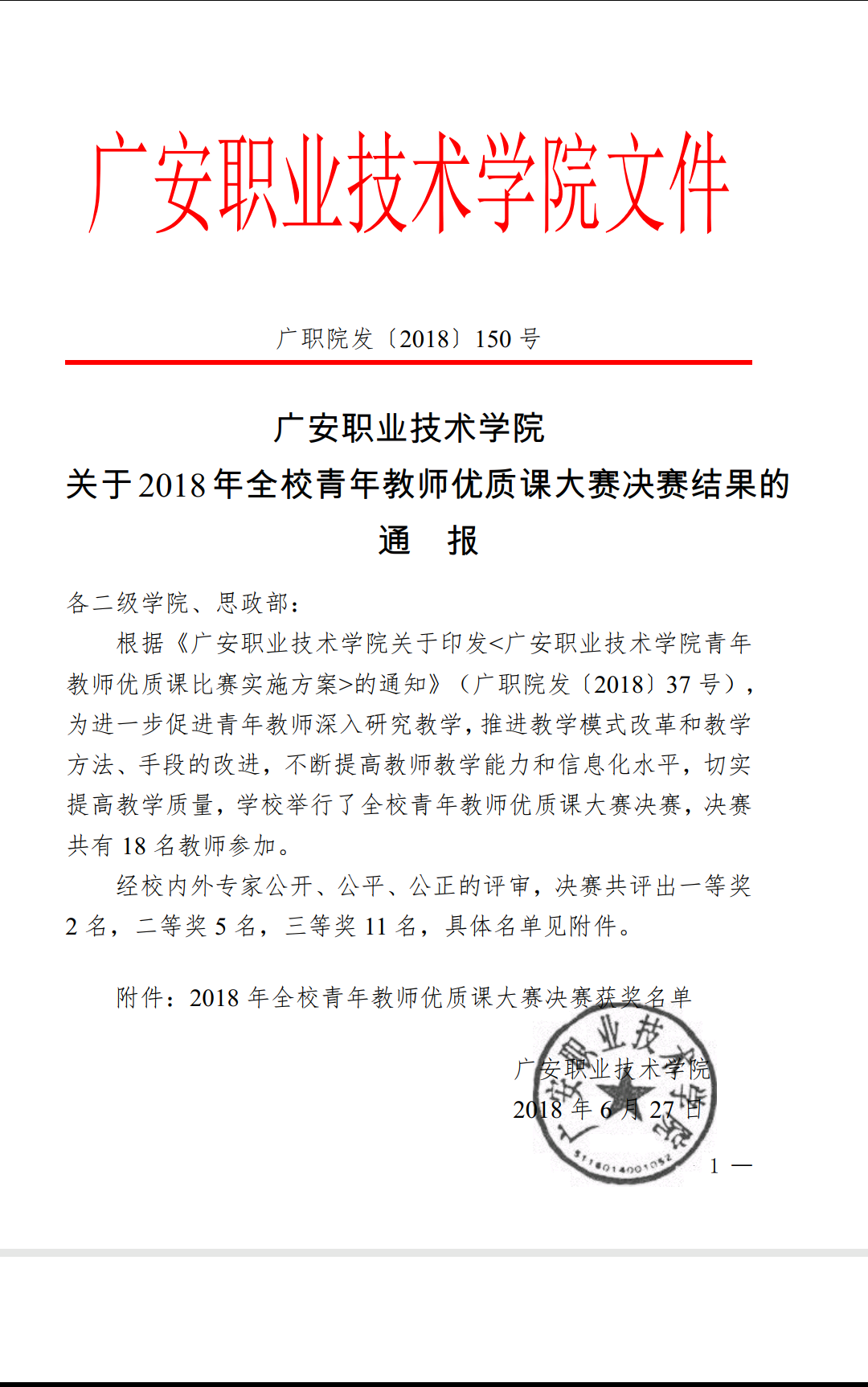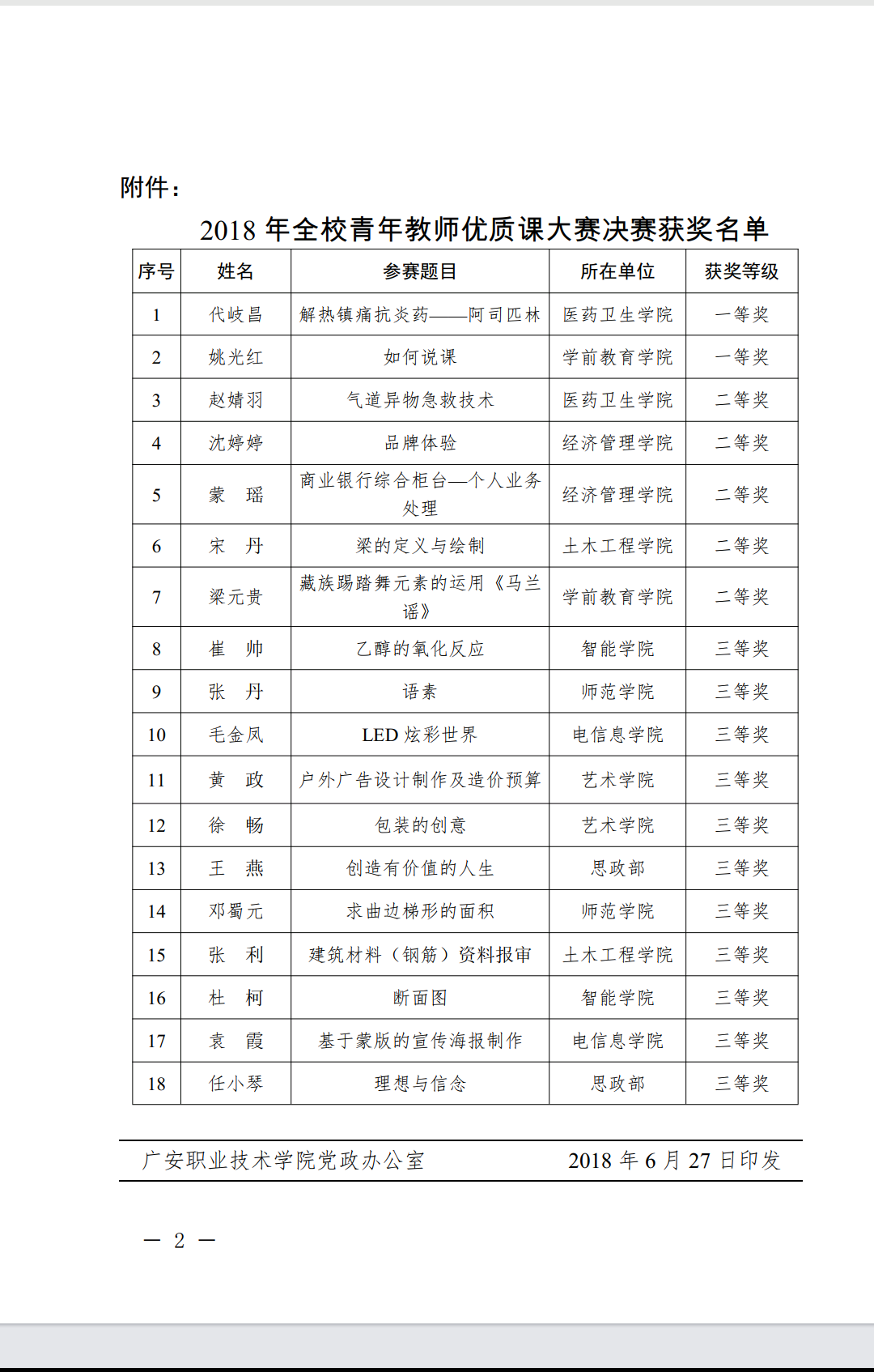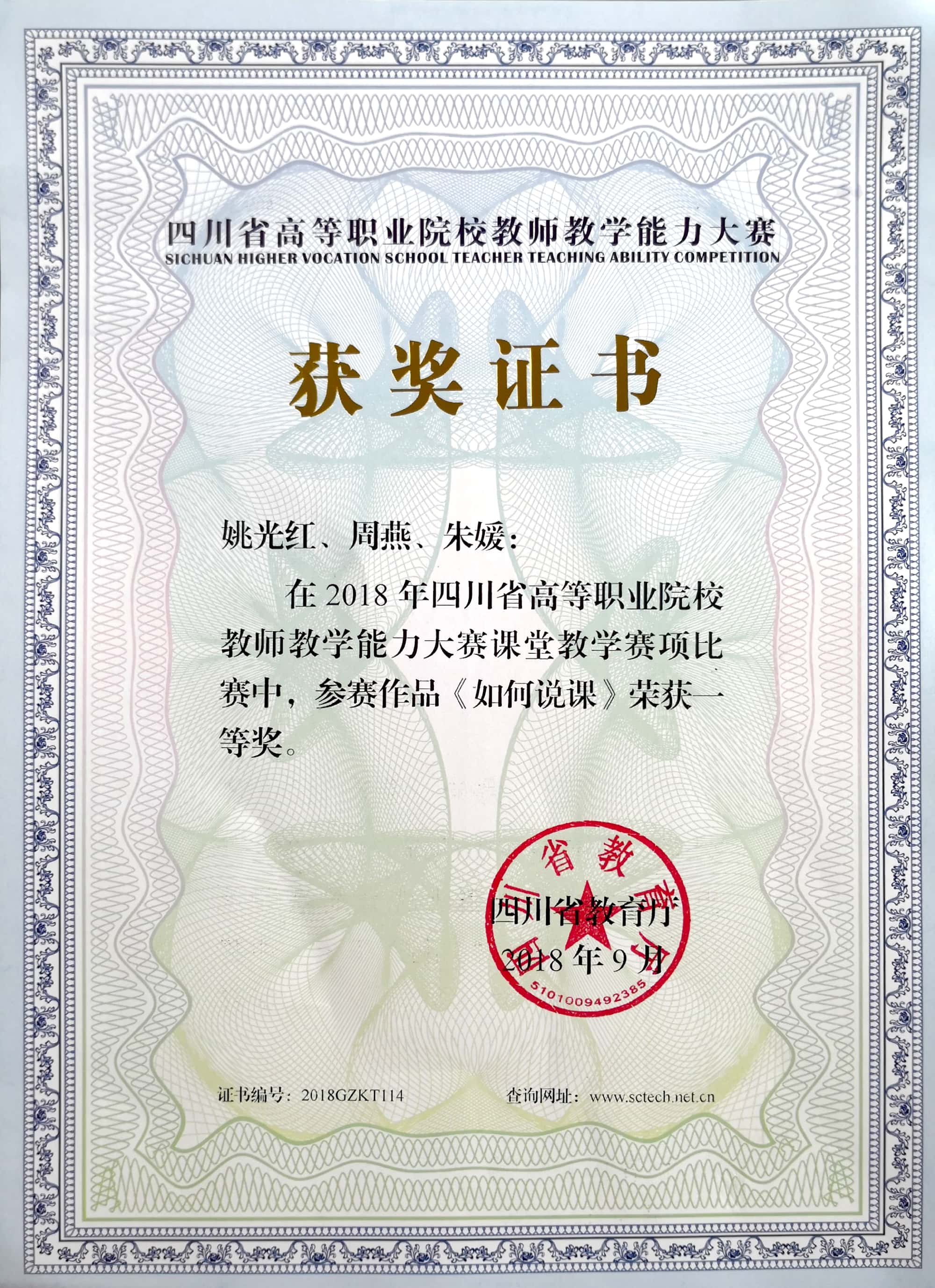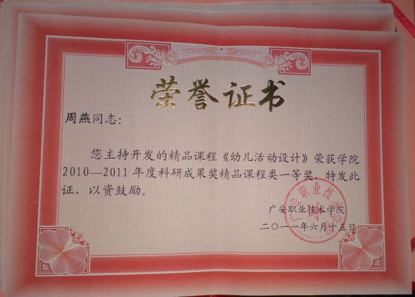 2018年:《幼儿活动设计》课程组获得职业院校教师教学能力大赛四川省省级一等奖、国家级二等奖。