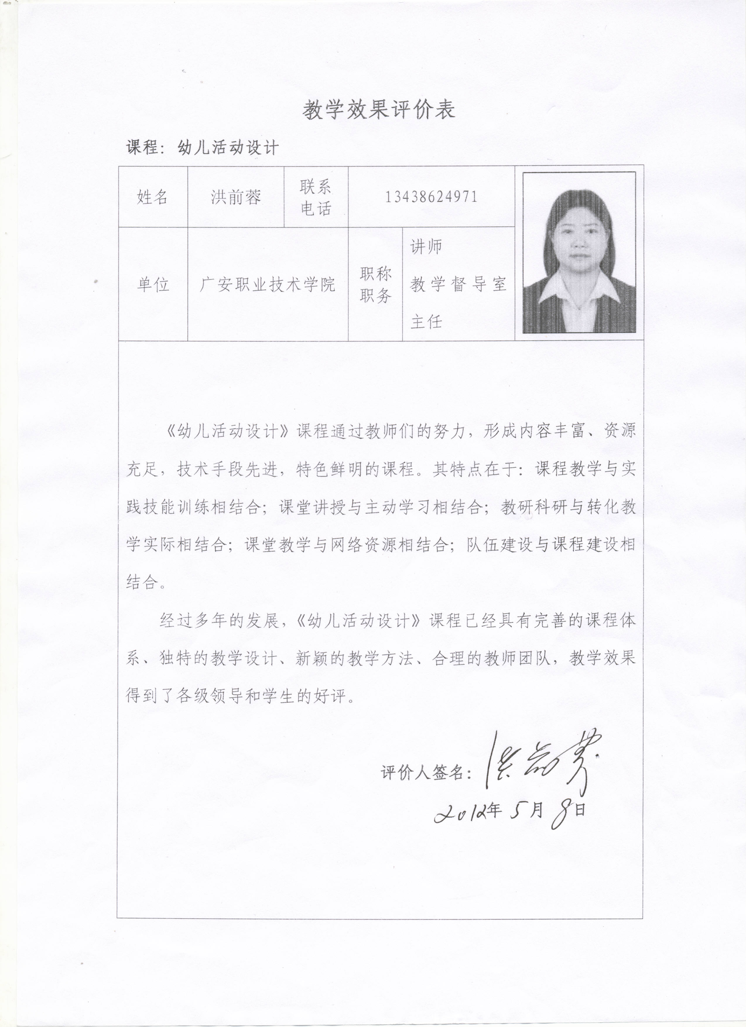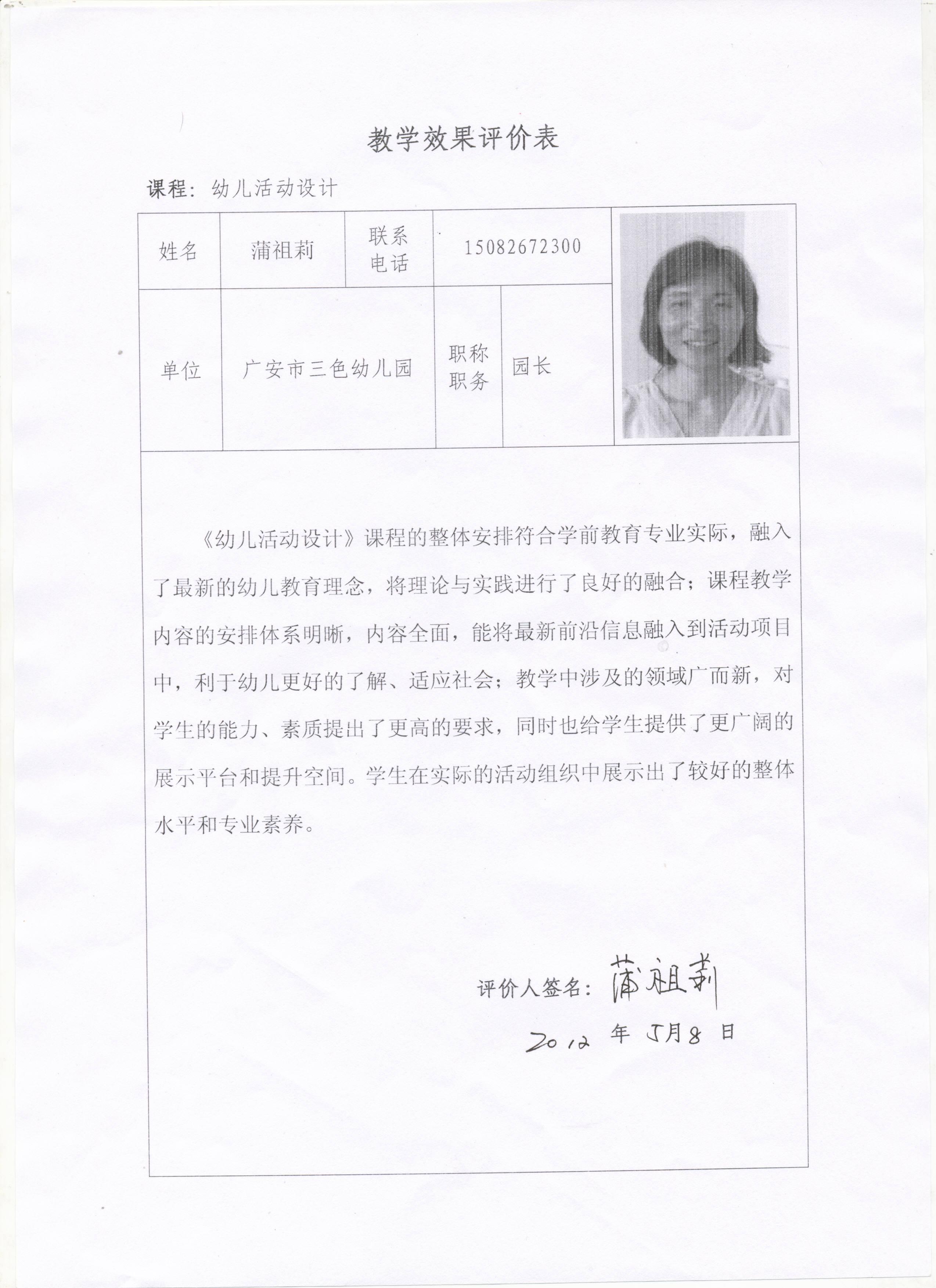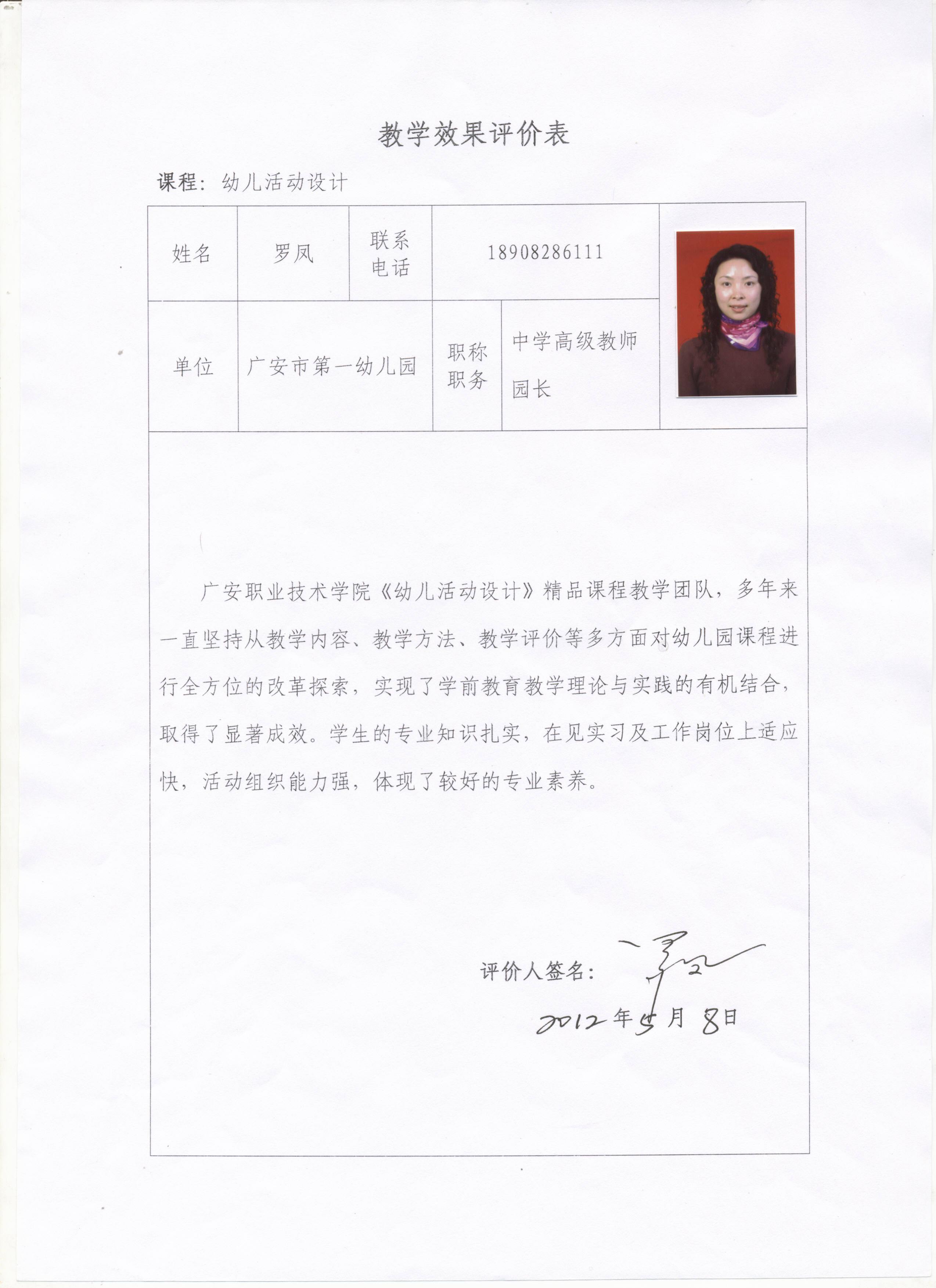 广安市第一幼儿园园长罗凤评价:广安职业技术学院《幼儿活动设计》精品课程教学团队,多年来一直坚持从教学内容、教学方法、教学评价等多方面对幼儿园课程进行全方位的改革探索,实现了学前教育教学理论与实践的有机结合,取得了显著成效。学生的专业知识扎实,在见实习及工作岗位上适应快,活动组织能力强,体现了较好的专业素养。
