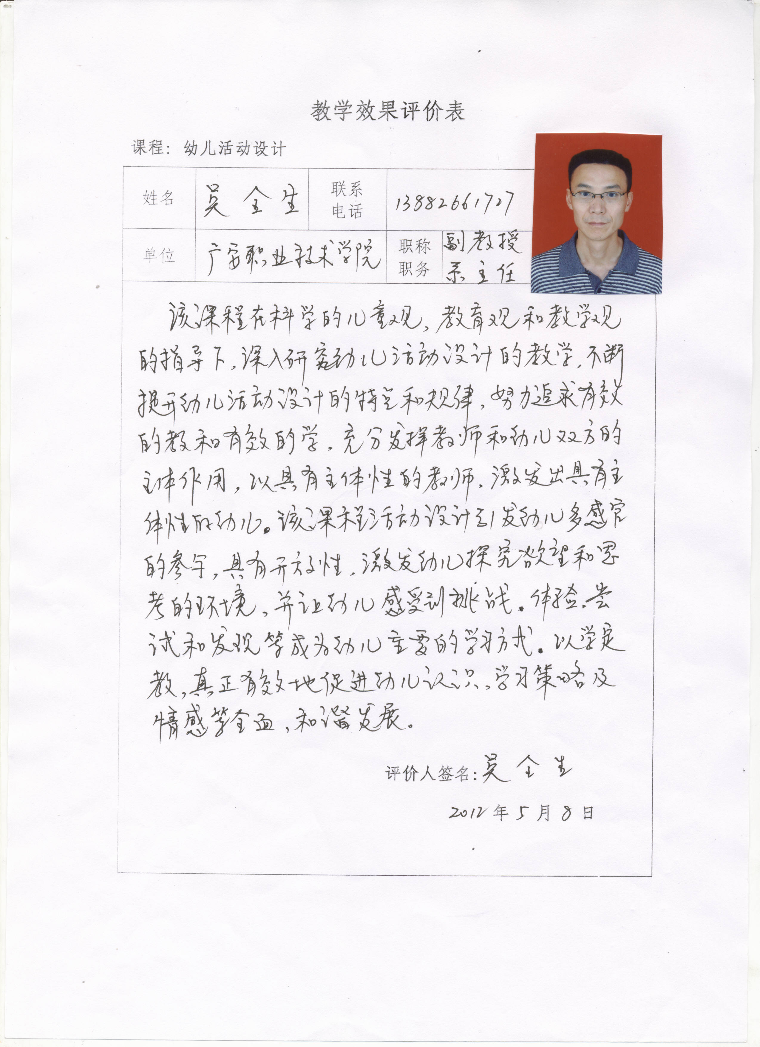 学生评价:《幼儿活动设计》课程在学生评教中历年均获得优秀。