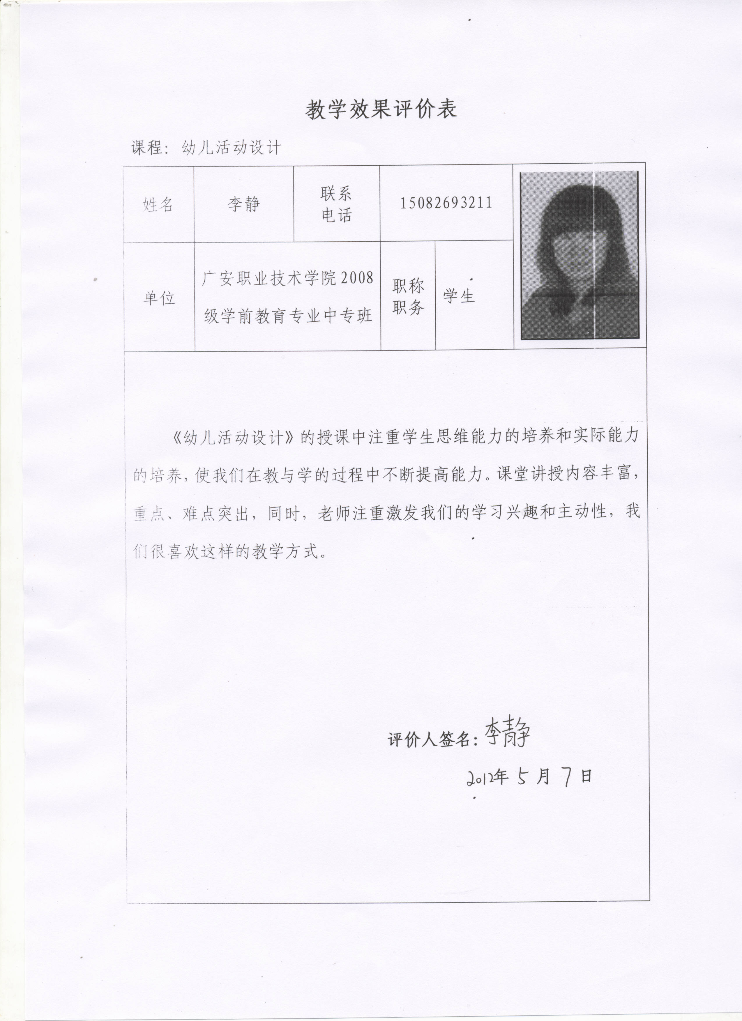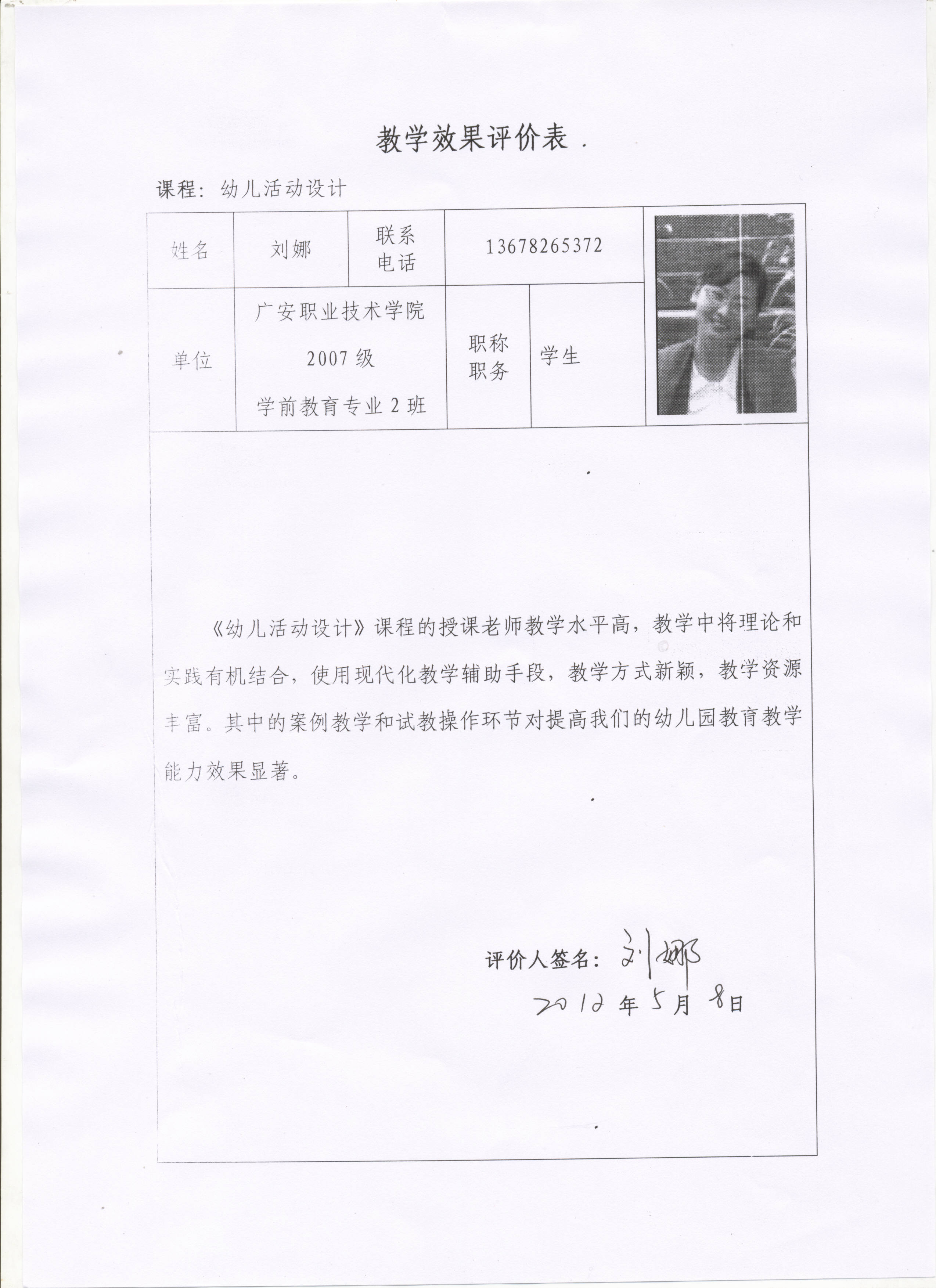 学生刘娜评价:《幼儿活动设计》课老师的教学水平高,教学中理论、实际有机结合,使用现代化教学辅助手段,教学方式新颖,教学资源丰富。其中的案例教学和试教操作环节对提高我们的教学能力效果显著。