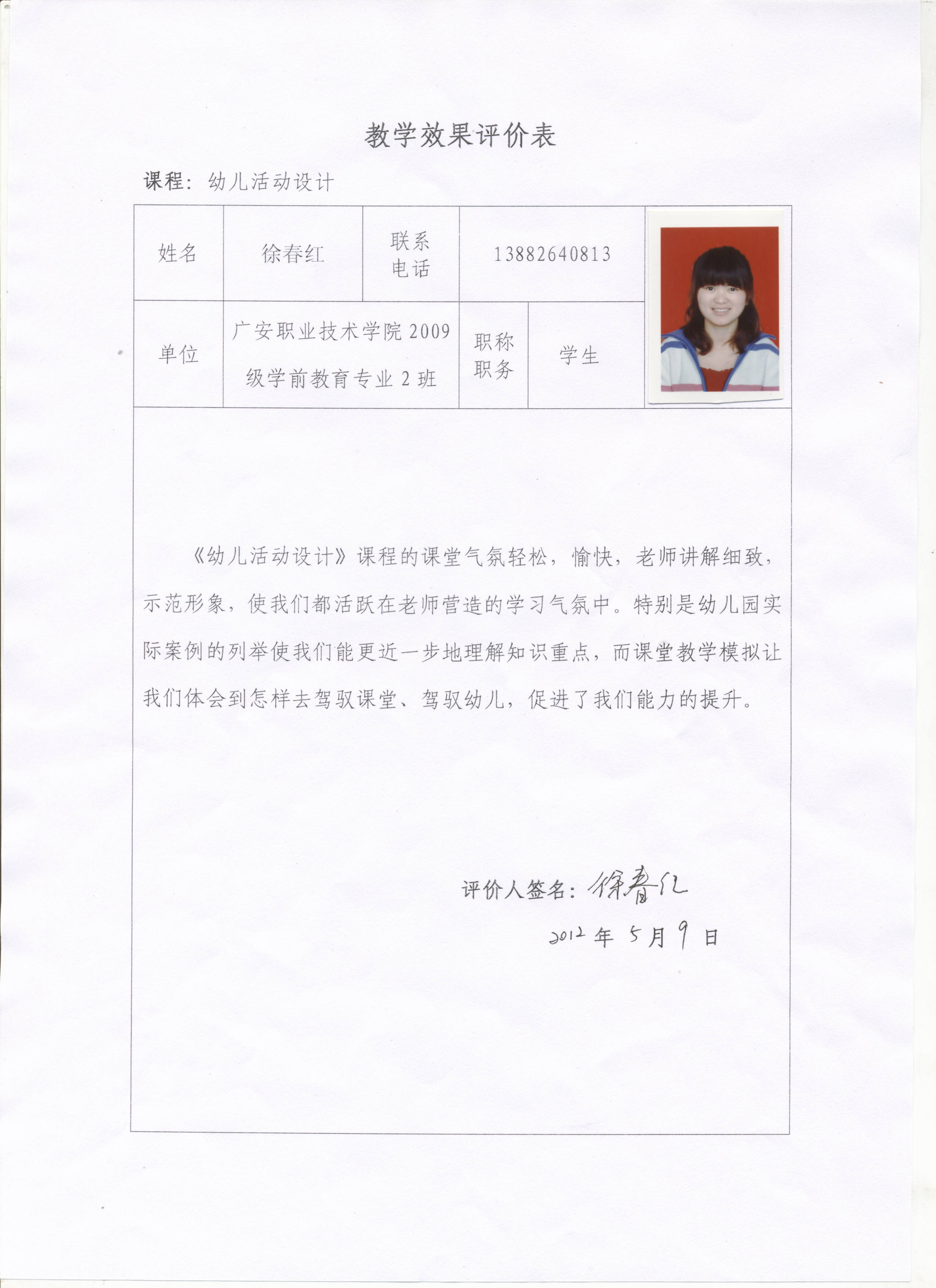 学生徐春红评价:《幼儿活动设计》课程的课堂气氛轻松,愉快,老师讲解细致,示范形象,使我们都活跃在老师营造的学习气氛中。特别是幼儿园实际案例的列举使我们能更近一步地理解知识重点,而课堂教学模拟让我们体会到怎样去驾驭课堂、驾驭幼儿,促进了我们能力的提升。