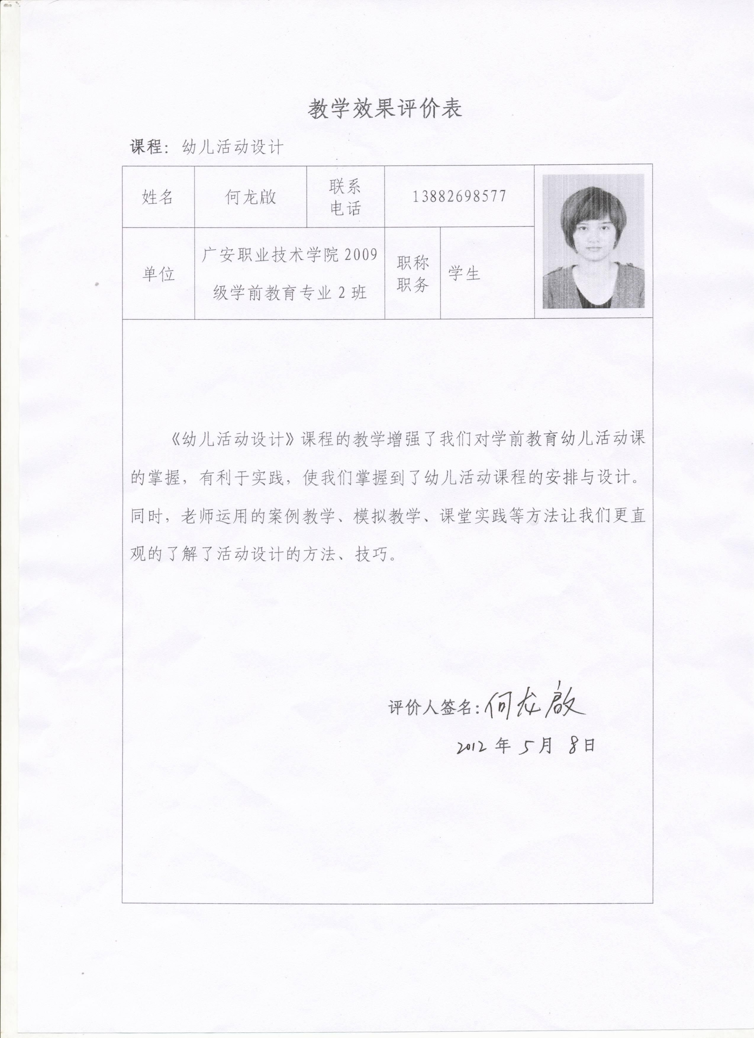 学生何龙啟评价:《幼儿活动设计》课程的教学增强了我们对学前教育幼儿活动课的掌握,有利于实践,使我们掌握到了幼儿活动课程的安排与设计。同时,老师运用的案例教学、模拟教学、课堂实践等方法让我们更直观的了解了活动设计的方法、技巧。