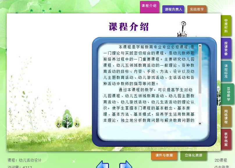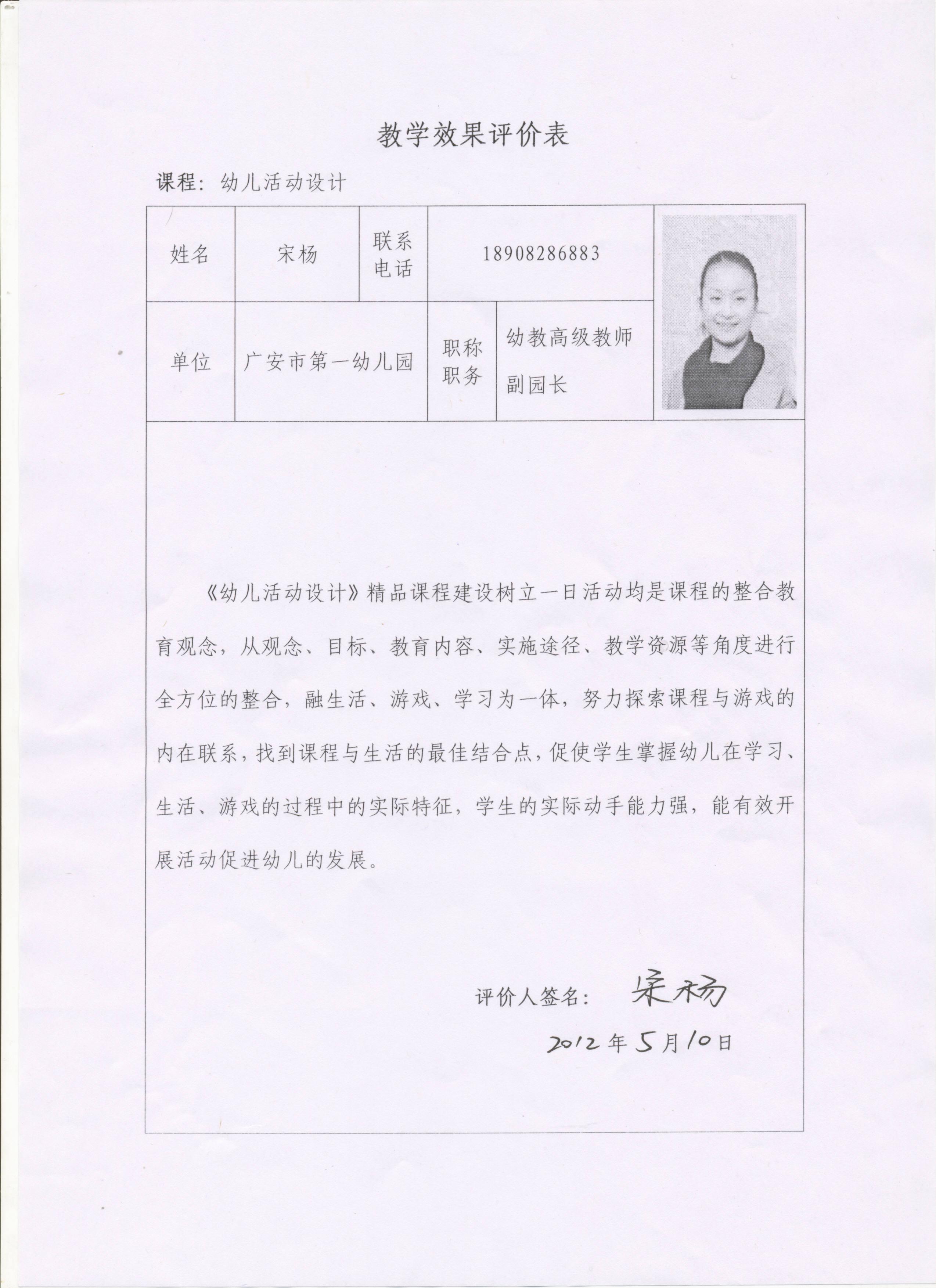 广安市第一幼儿园副园长宋杨评价:《幼儿活动设计》精品课程建设树立一日活动均是课程的整合教育观念,从观念、目标、教育内容、实施途径、教学资源等角度进行全方位的整合,融生活、游戏、学习为一体,努力探索课程与游戏的内在联系,找到课程与生活的最佳结合点,促使学生掌握幼儿在学习、生活、游戏的过程中的实际特征,学生的实际动手能力强,能有效开展活动促进幼儿的发展。