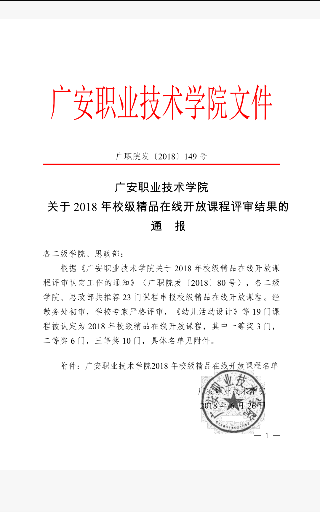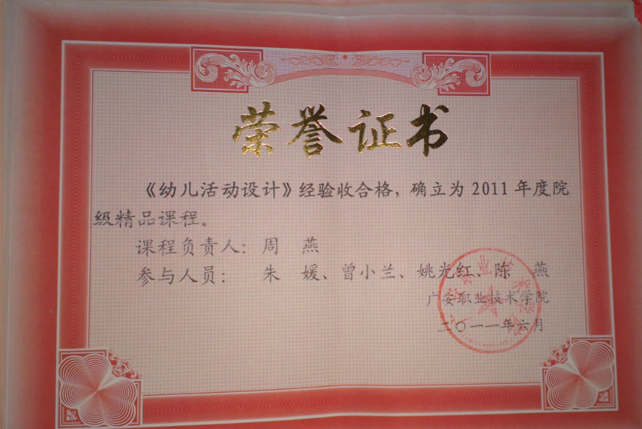 2020年:《幼儿活动设计》被认定为四川省省级课程思政示范课程。(川教函【2020】28号)