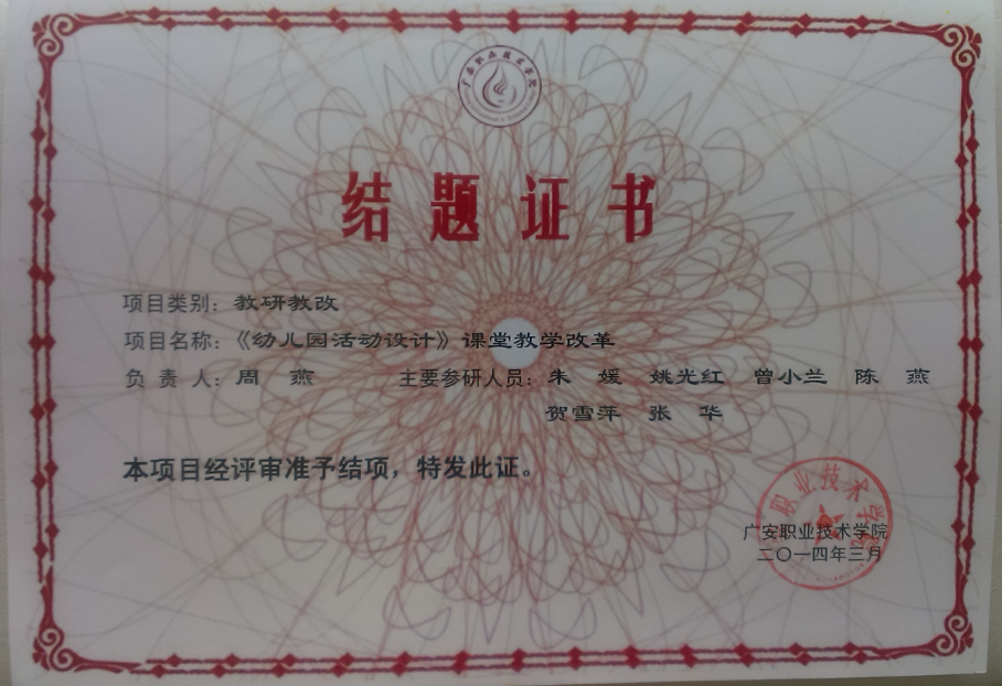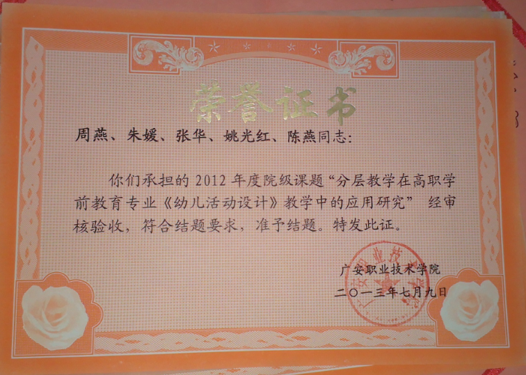2020年:《幼儿活动设计》课程组获得职业院校教师教学能力大赛四川省省级三等奖。