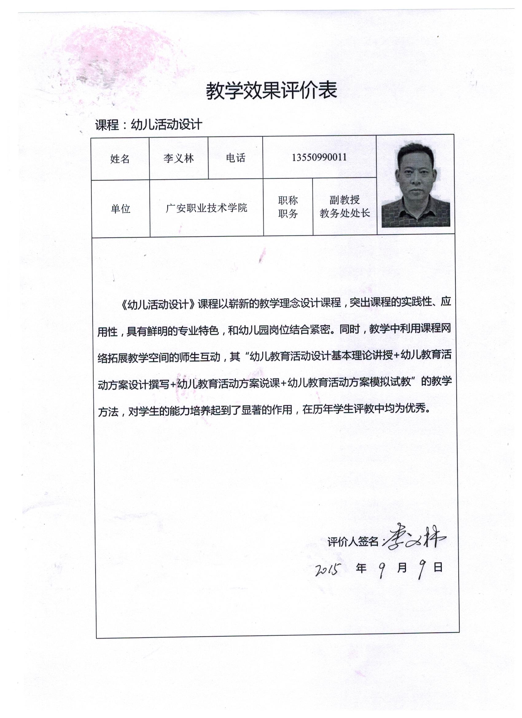 师范学院院长李义林副教授评价:《幼儿活动设计》课程以崭新的教学理念设计课程,突出课程的实践性、应用性,具有鲜明的专业特色,和幼儿园岗位结合紧密。同时,教学中利用课程网络拓展教学空间的师生互动,其“幼儿教育活动设计基本理论讲授+幼儿教育活动方案设计撰写+幼儿教育活动方案说课+幼儿教育活动方案模拟试教”的教学方法,对学生的能力培养起到了显著的作用。