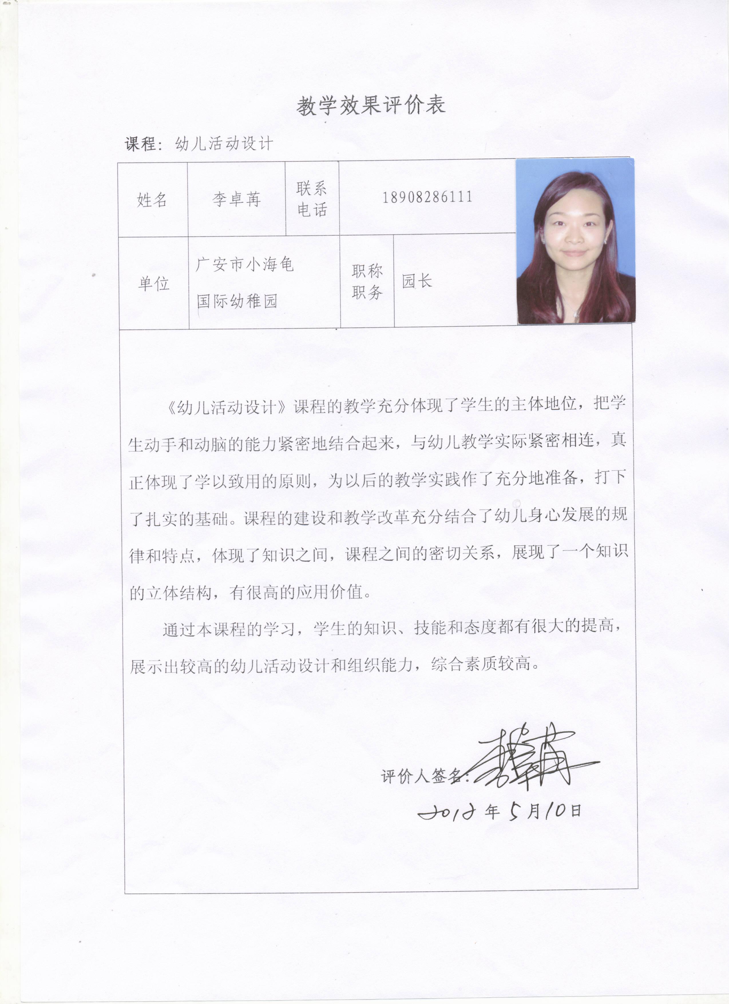 广安市小海龟国际幼稚园园长李卓苒评价:《幼儿活动设计》课程的教学充分体现了学生的主体地位,把学生动手和动脑的能力紧密地结合起来,与幼儿教学实际紧密相连,真正体现了学以致用的原则,为以后的教学实践作了充分地准备,打下了扎实的基础。课程的建设和教学改革充分结合了幼儿身心发展的规律和特点,体现了知识之间,课程之间的密切关系,展现了一个知识的立体结构,有很高的应用价值。通过本课程的学习,学生的知识、技能和态度都有很大的提高,展示出较高的幼儿活动设计和组织能力,综合素质较高。