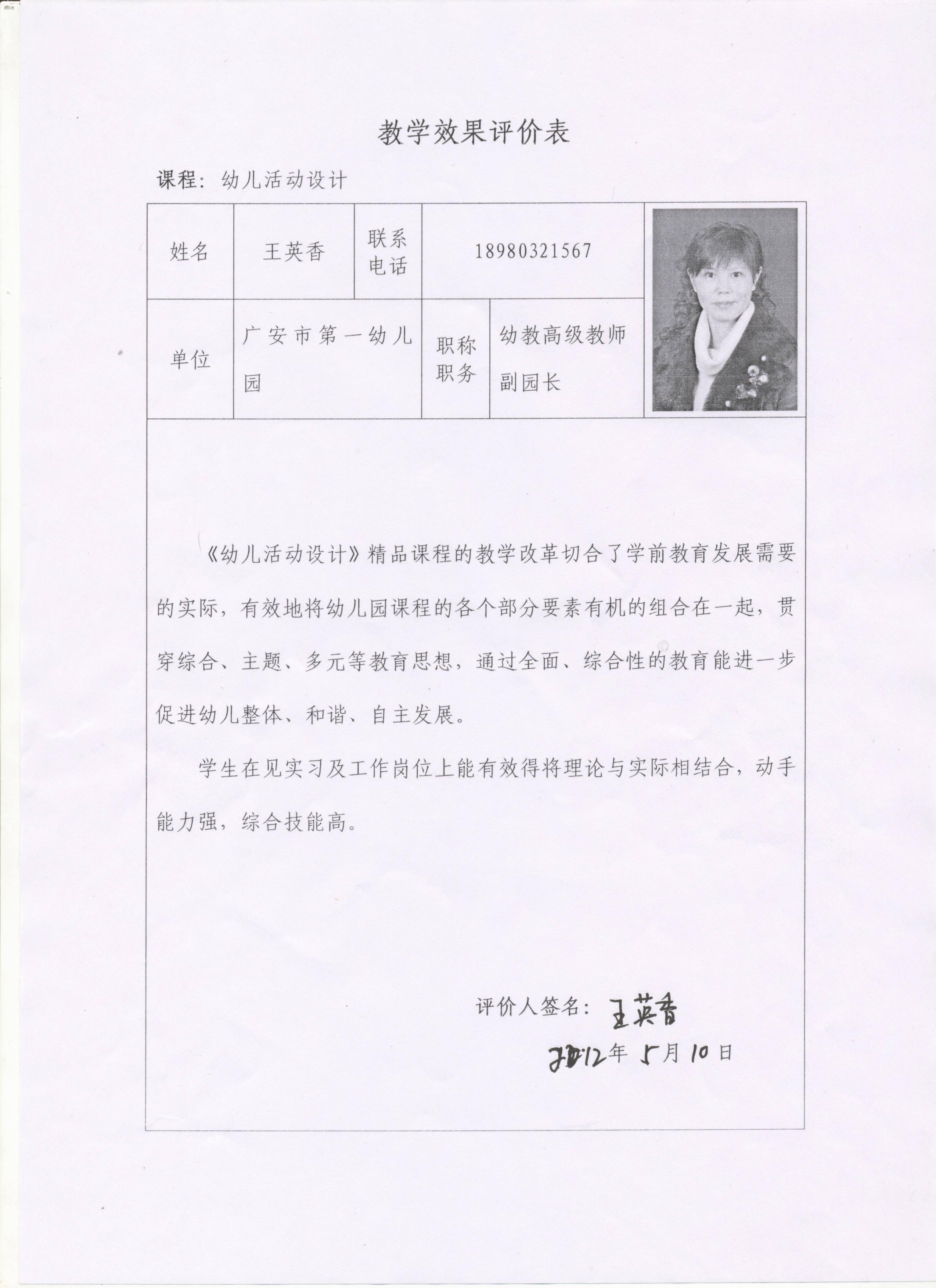 广安市第一幼儿园副园长王英香评价:《幼儿活动设计》精品课程的教学改革切合了学前教育发展需要的实际,有效地将幼儿园课程的各个部分要素有机的组合在一起,贯穿综合、主题、多元等教育思想,通过全面、综合性的教育能进一步促进幼儿整体、和谐、自主发展。学生在见实习及工作岗位上能有效得将理论与实际相结合,动手能力强,综合技能高。