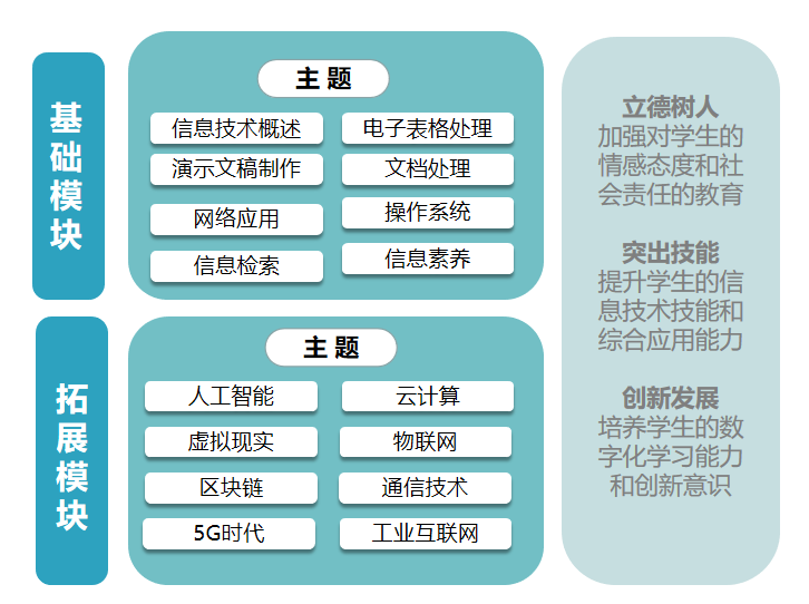课程内容由基础模块和拓展模块两部分构成,基础模块是学生提升信息素养的基础,包含信息素养、办公软件技术等内容。拓展模块是学生深化对信息技术的理解,拓展其职业能力的基础,包含大数据、人工智能、物联网、区块链等内容。
