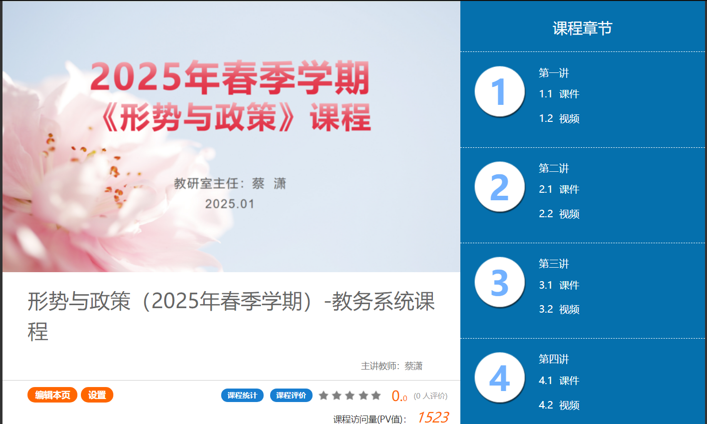 本门课程为高校本科阶段六门思想政治理论课之一,本课程主要是帮助学生全面正确地认识党和国家面临的国际国内形势和任务,拥护党的路线、方针和政策,增强实现中国式现代化和社会主义强国宏伟目标的信心和社会责任感,使新时代大学生能够运用马克思主义国际观的知识和方法去分析现实生活中的一些问题,把理论渗透到实践中,指导自己的行为。