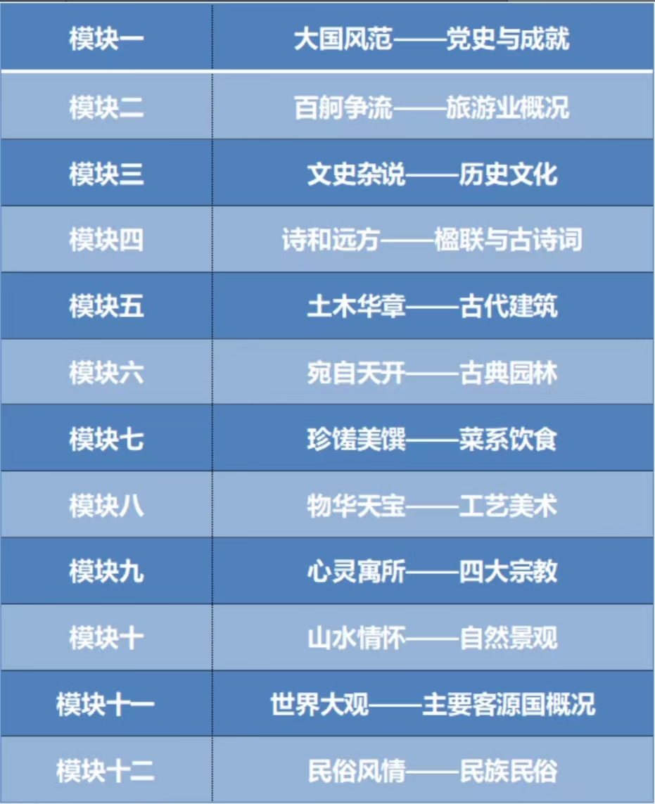 化是旅游的灵魂,旅游是文化的载体。《全国导游基础知识》课程融入1+X证书考证要求,结合导游服务技能竞赛和导游岗位能力需求,对我国旅游文化元素进行模块化教学,分历史文化、旅游文学 、民族民俗、宗教文化、建筑艺术、园林艺术、饮食文化、风物特产、旅游景观、学子风采等十个模块进行教学,内容信息量大,可以说是上涉天文、下至地理、中关人事。