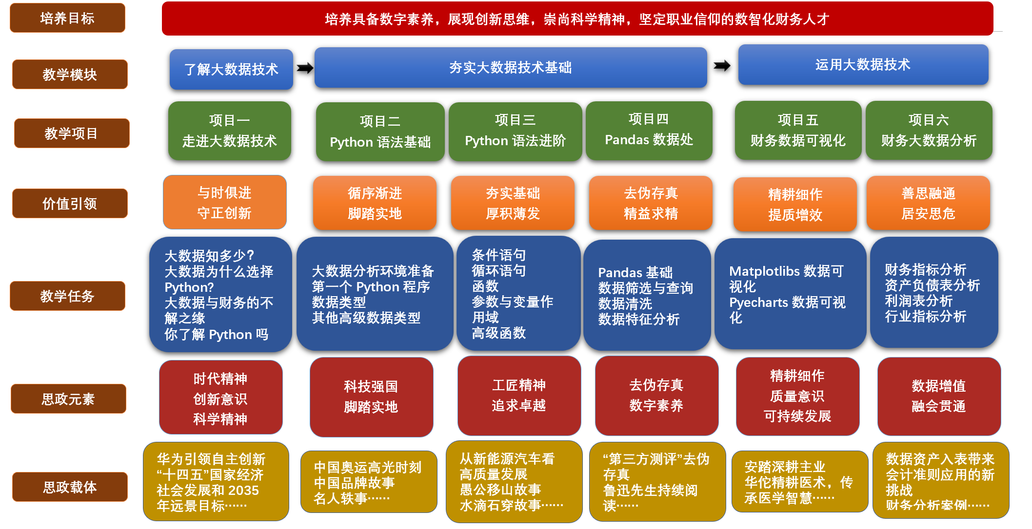 本课程是大数据与会计专业的专业拓展课,是实现专业数字化转型升级的必备课程,也是参加众多专业相关技能大赛的基础,更是培养财务人员数字素养和掌握常见大数据技术工具Python的重要课程。课程以立德树人为根本任务,校企双元合作开发,精准对接财务大数据分析岗位的技能要求,掌握使用大数据技术工具Python对财务数据进行处理和分析的能力,致力培养具备数字素养,展现创新思维,崇尚科学精神,坚定职业信仰的数智化会计人才。