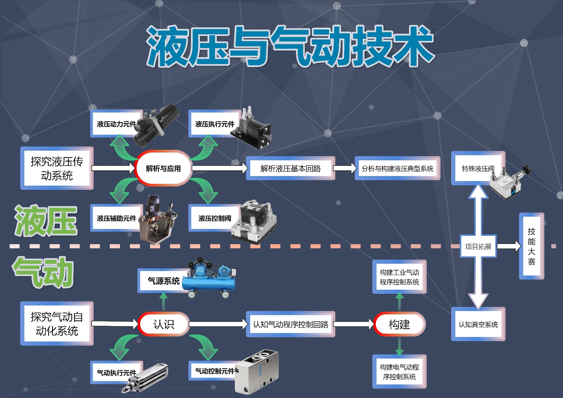 本课程是机电一体化技术专业的一门专业核心课程,主要强化液压与气动自动化解决方案的制定与实施这一环节,是培养学生专业能力的重要组成部分。 在人才培养方案中,本课程支撑学生能够按照功能要求设计一般液压与气动回路。熟练掌握液压传动系统的组装与调试,了解液压系统的维护方法;熟练掌握气动控制系统的组装、调试及一般故障排除,达到FESTO培训中心《现代液压与气动控制技术》课程的培训标准及考核要求,使学生具备机电设备(智能装备)装调、操作运行、维护维修、技术改造、生产管理以技术支持所必需的液压与气动技术知识与技能,为专业知识和职业技能的进一步提升打下坚实的基础。