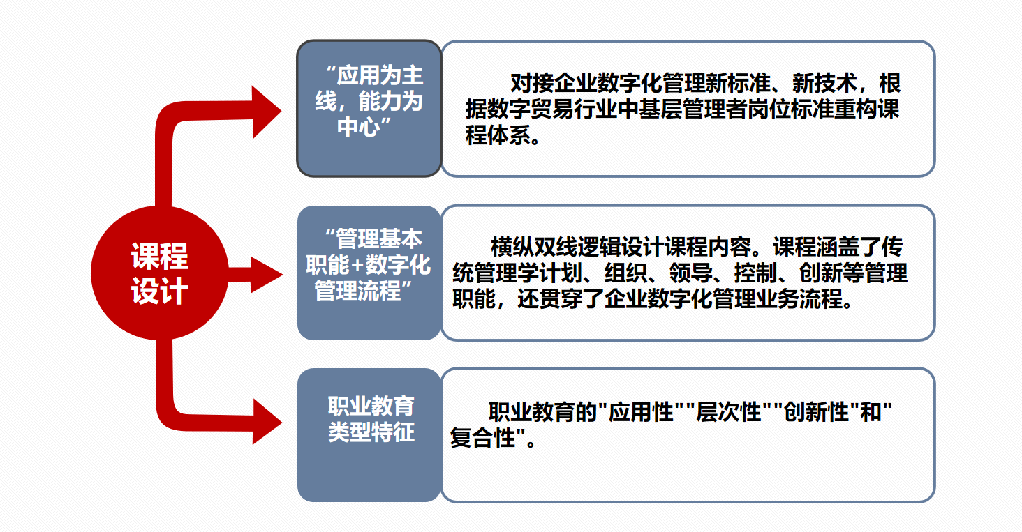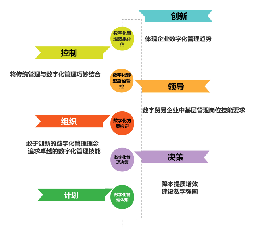 课程内容对接数字贸易行业企业中基层管理者岗位要求,结合数字化管理师职业技术技能标准,重构“管理基本职能+数字化管理流程”横纵双线课程体系。